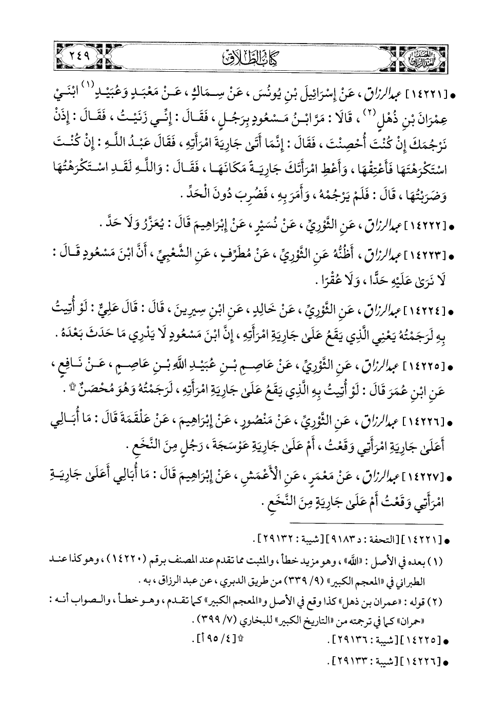 14221 - عبد الرزاق، عَن إِسْرَائِيلَ بْنِ يُونُسَ، عَن سِمَاكٍ، عَنْ مَعْبَدٍ، وَعُبَيدٍ، ابْنَيْ حُمْرَانَ (1) بْنِ ذُهْلٍ، قَالاَ: مَرَّ ابْنُ مَسْعُودٍ بِرَجُلٍ، فَقَالَ: إِنِّي زَنَيْتُ، فَقَالَ: إِذًا نَرْجُمُكَ إِنْ كُنْتَ أَحْصَنْتَ، فَقَالَ: إِنَّمَا أَتَى جَارِيَةَ امْرَأَتِهِ، فَقَالَ عَبدُ اللهِ: إِنْ كُنْتَ اسْتَكْرَهْتَهَا فَأَعْتِقْهَا، وَأَعْطِ امْرَأَتَكَ جَارِيَةً مَكَانَهَا، فَقَالَ: وَاللهِ لَقَدِ اسْتَكْرَهْتُهَا وَضَرَبْتُهَا، قَالَ: فَلَمْ يَرْجُمْهُ، وَأَمَرَ بِهِ، فَضُرِبَ دُونَ الْحَدِّ.