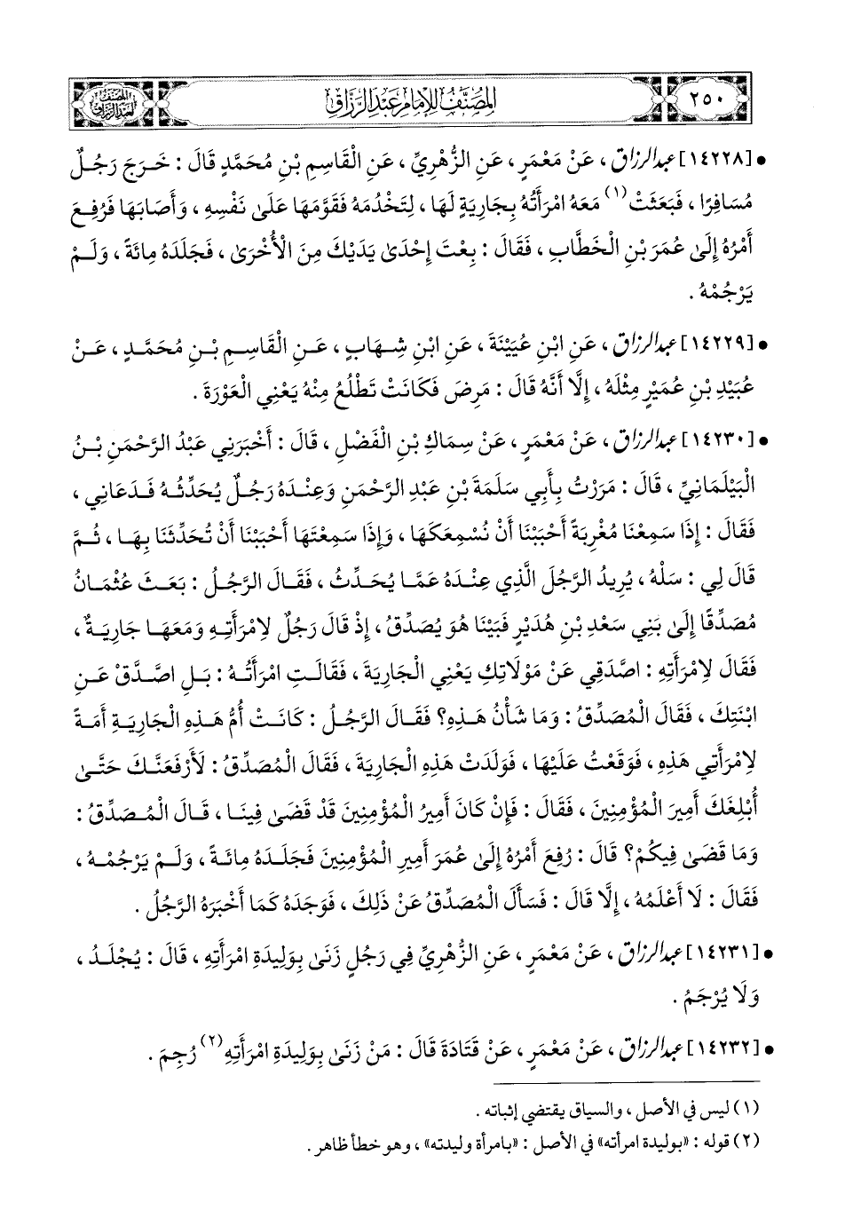 14230 - عبد الرزاق، عَنْ مَعْمَرٍ، عَن سِمَاكِ بْنِ الْفَضْلِ، قَالَ: أَخْبَرَنِي عَبدُ الرَّحْمَنِ بن الْبَيْلَمَانِيِّ، قَالَ: مَرَرْتُ بِأَبِي سَلَمَةَ بْنِ عَبدِ الرَّحْمَنِ، وَعِنْدَهُ رَجُلٌ يُحَدِّثُهُ، فَدَعَانِي، فَقَالَ: إِذَا سَمِعْنَا مُغْرِبَةً، أَحْبَبْنَا أَنْ نُسْمِعَكُمَا، وَإِذَا سَمِعْتَهَا أَحْبَبْنَا أَنْ تُحَدِّثَنا بِهَا (1)، ثُمَّ قَالَ لِي: سَلْهُ، يُرِيدُ الرَّجُلَ الَّذِي عِنْدَهُ عَمَّا يُحَدِّثُ. فَقَالَ الرَّجُلُ: بَعَثَ عُثْمَانُ مُصَدِّقًا إِلَى بَنِي سَعْدِ بْنِ هُدَيْرٍ، فَبَيْنَا هُوَ يُصَّدِّقُ، إِذْ قَالَ رَجُلٌ لاِمْرَأَتِهِ وَمَعَهَا جَارِيَةٌ، فَقَالَ لاِمْرَأَتِهِ: اصَّدَّقِي عَنْ مَوْلاَتِكِ، يَعْنِي الْجَارِيَةَ، فَقَالَتِ امْرَأَتُهُ: بَلِ اصَّدَّقْ عَنِ ابْنَتِكَ. فَقَالَ المُصَدِّقُ: وَمَا شَأَنُ هَذِهِ؟ فَقَالَ الرَّجُلُ: كَانَتْ أُمُّ هَذِهِ الْجَارِيَةِ أَمَةً لاِمْرَأَتِي هَذِهِ، فَوَقَعْتُ عَلَيْهَا، فَوَلَدَتْ هَذِهِ الْجَارِيَةَ، فَقَالَ المُصَدَّقُ: لأَرْفَعَنَّكَ، حَتَّى أُبْلِغَكَ أَمِيرَ المُؤْمِنِينَ. فَقَالَ [الرَّجُل] (2): فَإِنْ كَانَ أَمِيرُ المُؤْمِنِينَ قَدْ قَضَى فِينَا، قَالَ المُصَّدِّقُ: وَمَا قَضَى فِيكُمْ؟ قَالَ: رُفِعَ أَمْرُهُ إِلَى عُمَرَ أَمِيرِ المُؤْمِنِينَ، فَجَلَدَهُ مِئَةً، وَلَمْ يَرْجُمْهُ، فَقَالَ: لاَ أَعْلَمُهَ إِلاَّ قَالَ: فَسَأَلَ المُصَّدَّقُ عَن ذَلِكَ، فَوَجَدَهُ كَمَا أَخْبَرَهُ الرَّجُلُ.