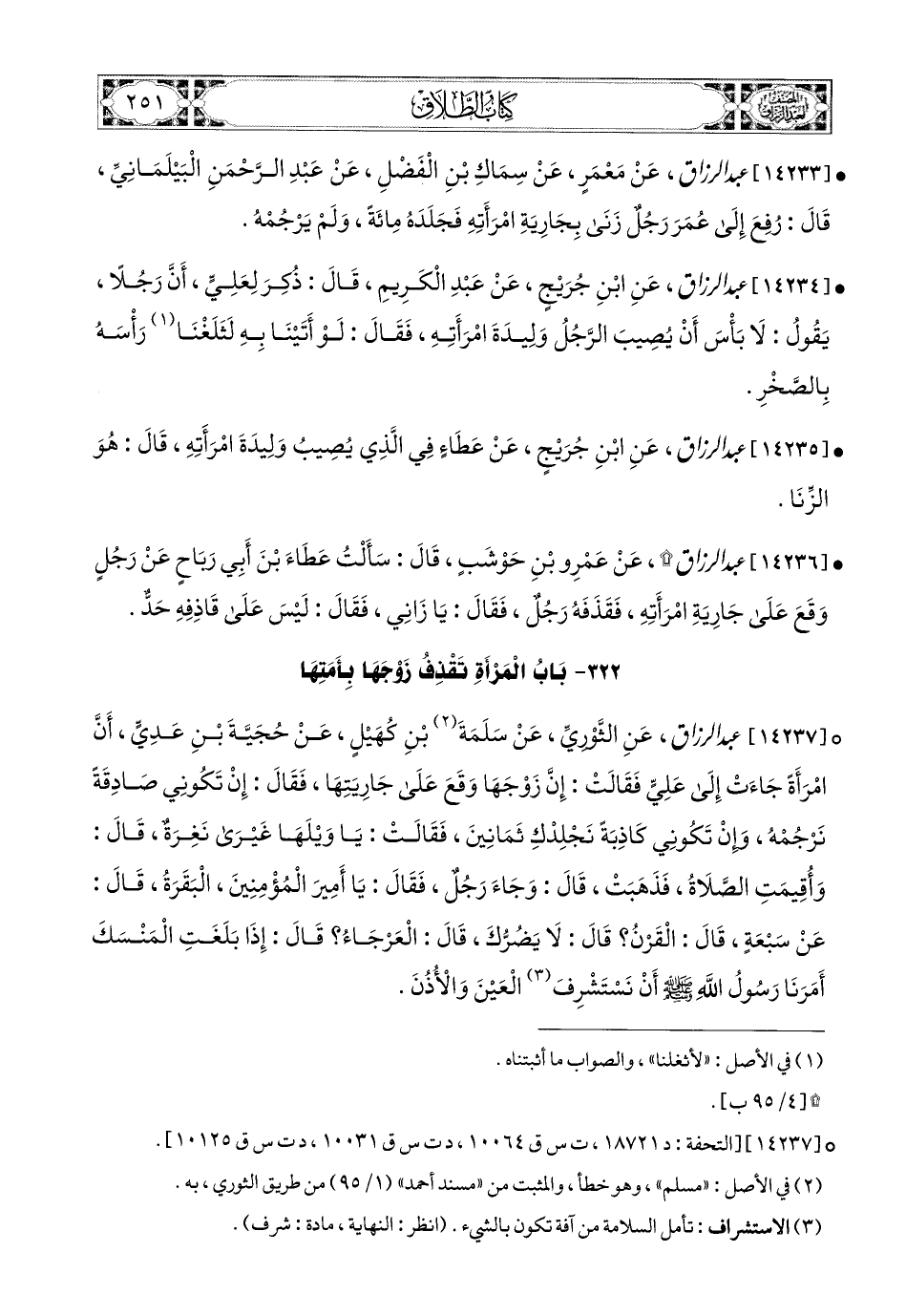 14233- عبد الرزاق، عَنْ مَعْمَرٍ، عَن سِمَاكِ بْنِ الْفَضْلِ، عَنْ عَبدِ الرَّحْمَنِ الْبَيْلَمَانِيِّ، قَالَ: رُفِعَ إِلَى عُمَرَ رَجُلٌ زَنَى بِجَارِيَةِ امْرَأَتِهِ، فَجَلَدَهُ مِئَةً، وَلَمْ يَرْجُمْهُ.