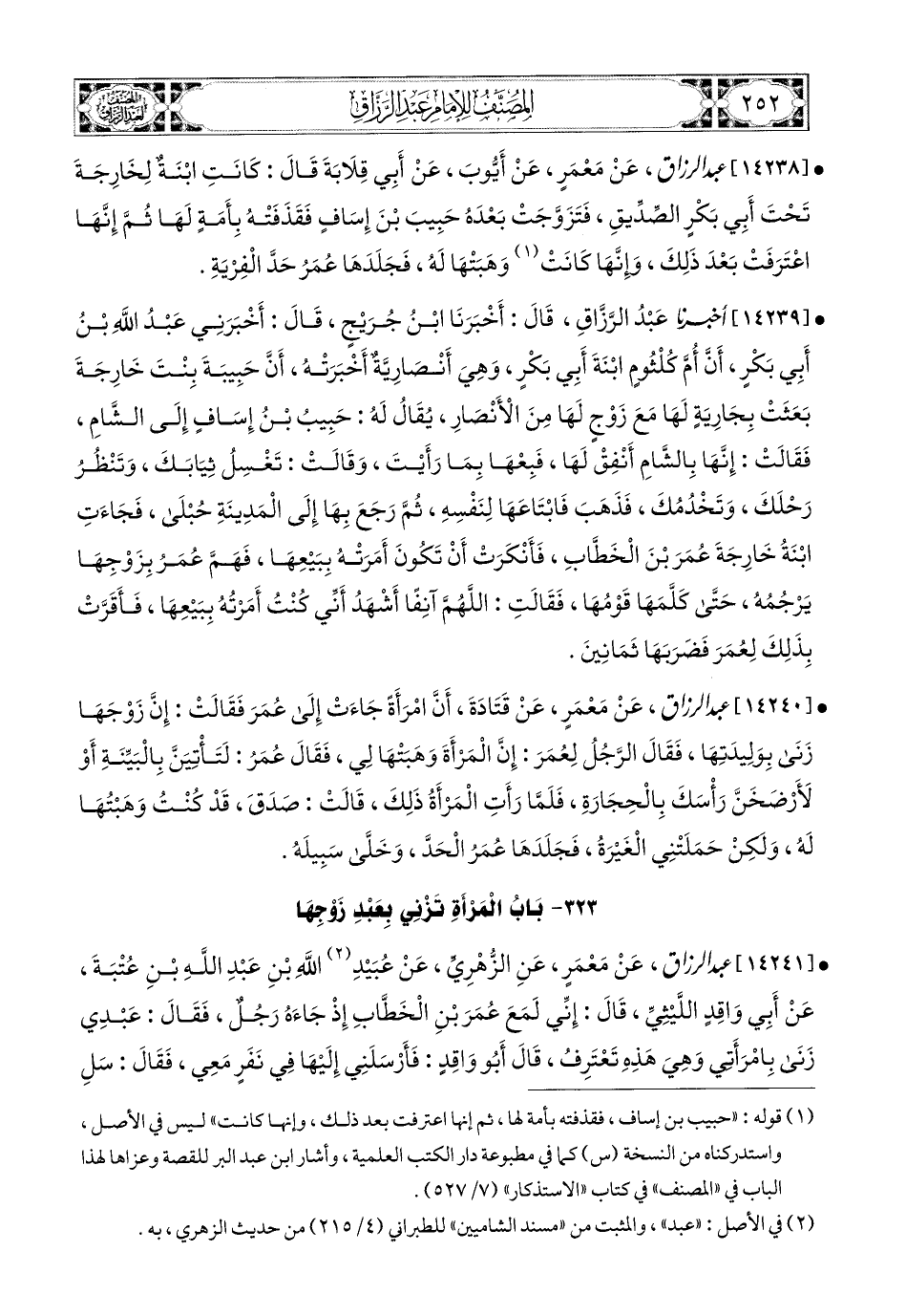 14239- أخبرنا عبد الرزاق، قَالَ: أَخْبَرَنَا ابْنُ جُرَيْجٍ، قَالَ: أَخْبَرَنِي عَبدُ اللهِ بن أَبِي بَكْرٍ، أَنَّ أُمَّ كُلْثُومٍ ابْنَةَ أَبِي بَكْرٍ، وَهِيَ أَنْصَارِيَّةٌ أَخْبَرَتْهُ، أَنَّ حَبِيبَةَ بِنْتَ خَارِجَةَ بَعَثَتْ بِجَارِيَةٍ لَهَا مَعَ زَوْجٍ لَهَا مِنَ الأَنْصَارِ، يُقَالُ لَهُ: حَبِيبُ بن إِسَافٍ إِلَى الشَّامِ، فَقَالَتْ: إِنَّهَا بِالشَّامِ أَنْفِقْ لَهَا، فَبِعْهَا بِمَا رَأَيْتَ، وَقَالَتْ: تَغْسِلُ ثِيَابَكَ، وَتَنْظُرُ رَحْلَكَ، وَتَخْدُمُكَ، فَذَهَبَ، فَابْتَاعَهَا لِنَفْسِهِ، ثُمَّ رَجَعَ بِهَا إِلَى المَدِينَةِ حُبْلَى، فَجَاءَتِ ابْنَةُ خَارِجَةَ عُمَرَ بن الْخَطَّابِ، فَأَنْكَرَتْ أَنْ تَكُونَ أَمَرَتْهُ بِبَيْعِهَا، فَهَمَّ عُمَرُ بِزَوْجِهَا يَرْجُمُهُ، حَتَّى كَلَّمَهَا قَوْمُهَا، فَقَالَتِ: اللهُمَّ آنِفًا أَشْهَدُ أَنِّي كُنْتُ أَمَرْتُهُ بِبَيْعِهَا، فَأَقَرَّتْ بِذَلِكَ لِعُمَرَ، فَضَرَبَهَا ثَمَانِينَ.