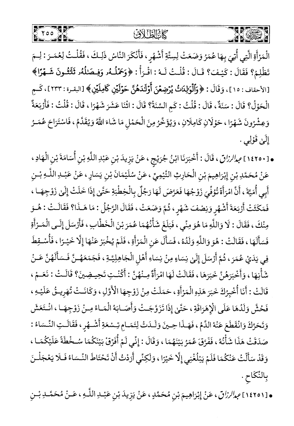 14250 - عبد الرزاق، قَالَ: أَخْبَرَنَا ابْنُ جُرَيْجٍ، عَن يَزِيدَ بْنِ عَبدِ اللهِ بْنِ أُسَامَةَ بْنِ الْهَادِ، عَن مُحَمَّدِ بْنِ إِبرَاهِيمَ بْنِ الْحَارِثِ التَّيْمِيِّ، عَن سُلَيْمَانَ بْنِ يَسَارٍ، عَنْ عَبدِ اللهِ بْنِ أَبِي أُمَيَّةَ، أَنَّ امْرَأَةً تُوُفِّيَ زَوْجُهَا، فَعَرَّضَ لَهَا رَجُلٌ بِالْخِطْبَةِ، حَتَّى إِذَا خَلَتْ إِلَى زَوْجِهَا، فَمَكَثَتْ أَرْبَعَةَ أَشْهُرٍ وَنِصْفَ شَهْرٍ، ثُمَّ وَضَعَتْ، فَقَالَ الرَّجُلُ: مَا هَذَا؟ فَقَالَتْ: هُوَ مِنْكَ. فَقَالَ: لاَ وَاللهِ مَا هُوَ مِنِّي، فَبَلَغَ شَأْنُهُمَا عُمَرَ بن الْخَطَّابِ، فَأَرْسَلَ إِلَى المَرْأَةِ، فَسَأَلَهَا، فَقَالَتْ: هُوَ وَاللهِ وَلَدُهُ، فَسَأَلَ عَنِ المَرْأَةِ، فَلَمْ يُخْبَرْ عَنْهَا إِلاَّ خَيْرًا، فَأُسْقِطَ فِي يَدَيْ عُمَرَ، ثُمَّ أَرْسَلَ إِلَى نِسَاءٍ مِنْ نِسَاءِ أَهْلِ الْجَاهِلِيَّةِ، فَجَمَعَهُنَّ، فَسَأَلَهُنَّ عَن شَأْنِهَا، وَأَخْبَرَهُنَّ خَبَرَهَا، فَقَالَتْ لَهَا امْرَأَةٌ مِنْهُنَّ: أَكُنْتِ تَحِيضِينَ؟ قَالَتْ: نَعَمْ. قَالَتْ: أَنَا أُخْبِرُكَ خَبَرَ هَذِهِ المَرْأَةِ، حَمَلَتْ مِنْ زَوْجِهَا الأَوَّلِ، وَكَانَتْ تُهْرِيقُ عَلَيْهِ، فَحُشَّ (1) وَلَدُهَا عَلَى الإِهْرَاقَةِ، حَتَّى إِذَا تَزَوَّجَتْ وَأَصَابَهُ المَاءُ مِنْ زَوْجِهَا انْتَعَشَ وَتَحَرَّكَ، وَانْقَطَعَ عَنْهُ الدَّمُ، فَهَذَا حِينَ وَلَدَتْ لِتَمَامِ تِسْعَةِ أَشْهُرٍ. فَقَالَتِ النِّسَاءُ: صَدَقَتْ، هَذَا شَأْنُهُ. فَفَرَّقَ عُمَرُ بَيْنَهُمَا، وَقَالَ: إِنِي لَمْ أُفَرِّقْ بَيْنَكُمَا سَخْطَةً عَلَيْكُمَا، وَقَدْ سَأَلْتُ عَنْكُمَا، فَلَمْ يَبْلُغْنِي إِلاَّ خَيْرًا، وَلَكِنِّي أَرَدْتُ أَنْ تَحْتَاطَ النِّسَاءُ، فَلاَ يَعْجَلْنَ بِالنِّكَاحِ.