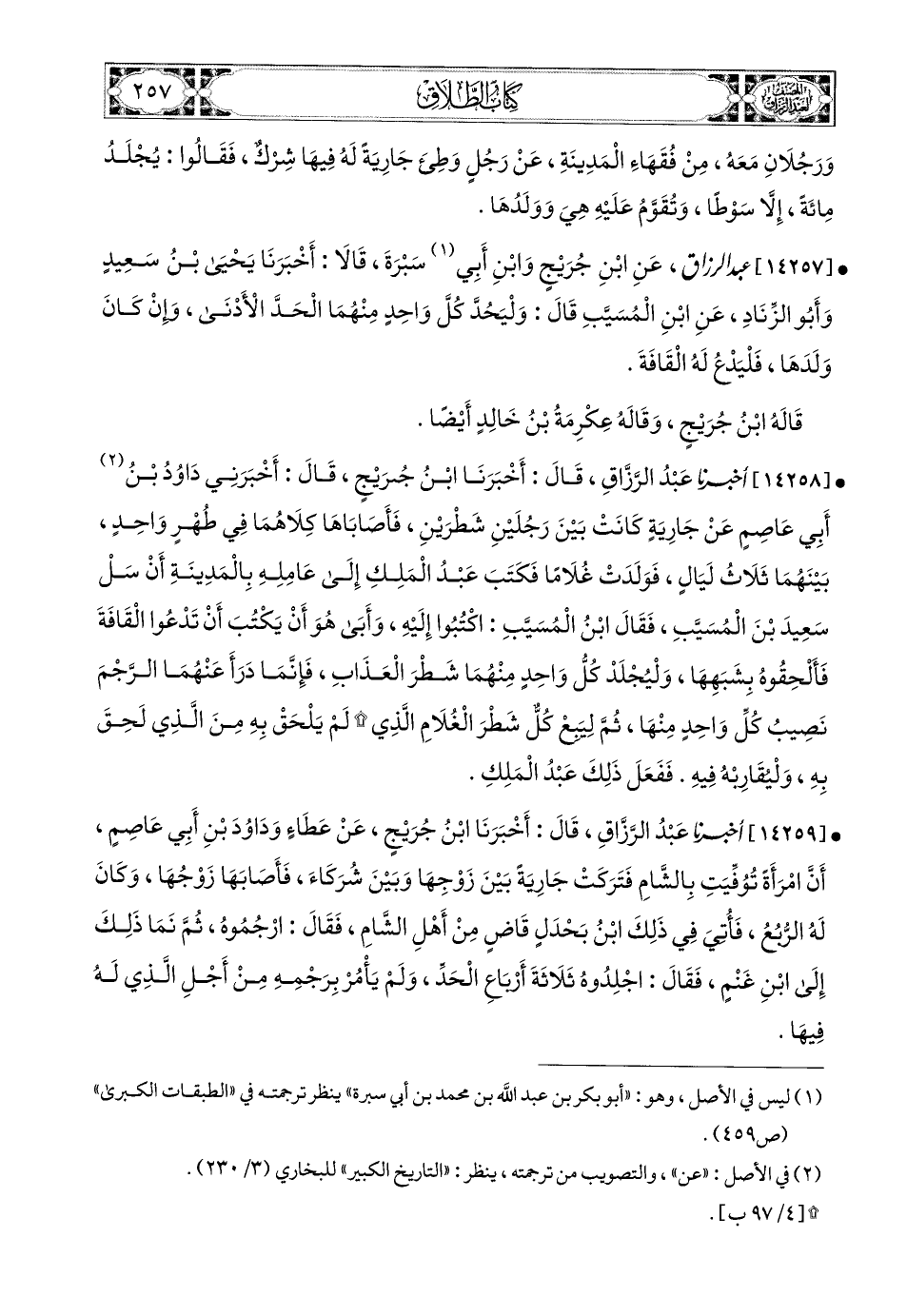 14258- أخبرنا عبد الرزاق، قَالَ: أَخْبَرَنَا ابْنُ جُرَيْجٍ، قَالَ: أَخْبَرَنِي دَاوُدُ بن أَبِي عَاصِمٍ، عَن جَارِيَةٍ كَانَتْ بَيْنَ رَجُلَيْنِ شَطْرَيْنِ، فَأَصَابَاهَا كِلاَهُمَا فِي طُهْرٍ وَاحِدٍ، بَيْنَهُمَا ثَلاَثُ لَيَالٍ، فَوَلَدَتْ غُلاَمًا، فَكَتَبَ عَبدُ المَلِكِ إِلَى عَامِلِهِ بِالمَدِينَةِ: أَنْ سَلْ سَعيدَ بن المُسَيَّبِ، فَقَالَ ابْنُ المُسَيَّبِ: اكْتُبُوا إِلَيْهِ، وَأَبَى هُوَ أَنْ يَكْتُبَ أَنْ تَدْعُوا الْقَافَةَ، فَأَلْحِقُوهُ بِشَبَهِهما، وَلْيُجْلَدْ كُلُّ وَاحِدٍ مِنْهُمَا شَطْرَ الْعَذَابِ، فَإِنَّمَا دَرَأَ عَنْهُمَا الرَّجْمَ نَصِيبُ كُلِّ وَاحِدٍ مِنْهَا، ثُمَّ لْيَبِعْ كُلٌّ شَطْرَ الْغُلاَمِ الَّذِي لَمْ يُلْحَقْ بِهِ مِنَ الَّذِي لُحِقَ بِهِ، وَلْيُقَارِبْهُ فِيهِ، فَفَعَلَ ذَلِكَ عَبدُ المَلِكِ.