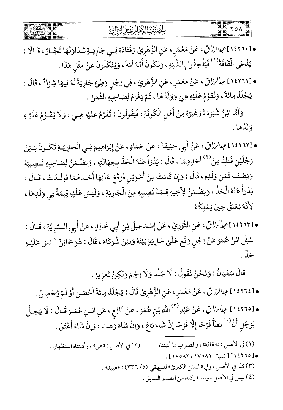 14260- عبد الرزاق، عَنْ مَعْمَرٍ، عَنِ الزُّهْرِيِّ، وَقَتَادَةَ، فِي جَارِيَةٍ تَدَاوَلَهَا تُجَّارٌ؟ قَالاَ: يُدْعَى الْقَافَةُ، فَيُلْحِقُوا بِالشَّبِهِ، وَتَكُونُ أُمُّهُ أَمَةً، وَيُنَكَّلُونَ عَن مِثْلِ هَذَا.