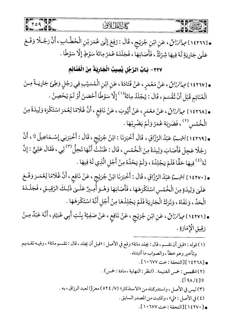 14267- عبد الرزاق، عَنْ مَعْمَرٍ، عَن قَتَادَةَ، عَنِ ابْنِ المُسَيَّبِ؛ فِي رَجُلٍ وَطِئَ جَارِيَةً مِنَ الْغَنَائِمِ قَبْلَ أَنْ تُقْسَمَ، قَالَ: يُجْلَدُ مِئَةً، إِلاَّ سَوْطًا أُحْصِنَ، أَوْ لَمْ يُحْصَنْ.