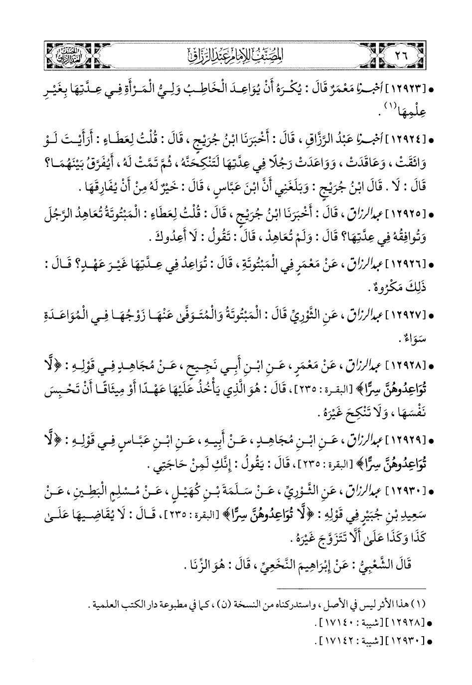 12928- عبد الرزاق، عَنْ مَعْمَرٍ، عَنِ ابْنِ أَبِي نَجِيحٍ، عَن مُجاهِدٍ، فِي قَوْلِهِ: {لاَ تُوَاعِدُوهُنَّ سِرًّا}، قَالَ: هُوَ الَّذِي يَأْخُذُ عَلَيْهَا عَهْدًا، أَوْ مِيثَاقًا أَنْ تَحْبِسَ نَفْسَهَا، وَلاَ تَنْكِحَ غَيْرَهُ.