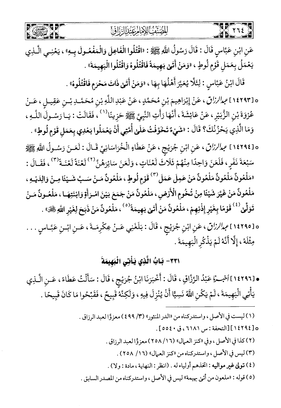 14294- عبد الرزاق، عَنِ ابْنِ جُرَيْجٍ، عَنْ عَطَاءٍ الْخُرَاسَانِيِّ، قَالَ: لَعَنَ رَسُولُ اللهِ صَلَّى اللهُ عَلَيْهِ وَسَلَّمَ سَبْعَةَ نَفَرٍ، فَلَعَنَ وَاحِدًا مِنْهُمْ ثَلاَثَ لَعْنَاتٍ، وَلَعَنَ سَائِرَهُنَّ لَعْنَةً لَعْنَةً، فَقَالَ: مَلْعُونٌ، مَلْعُونٌ، مَلْعُونٌ مَنْ عَمِلَ عَمَلَ قَوْمِ لُوطٍ، مَلْعُونٌ مَنْ سَبَّ شَيْئًا مِنْ وَالِدَيْهِ، مَلْعُونٌ مَنْ غَيَّرَ شَيْئًا مِنْ تُخُومِ الأَرْضِ، مَلْعُونٌ مَنْ جَمَعَ بَيْنَ امْرَأَةٍ وَابْنَتِهَا، مَلْعُونٌ مَنْ تَوَلَّى قَوْمًا بِغَيْرِ إِذْنِهِمْ، مَلْعُونٌ مَنْ أَتَى بَهِيمَةً، مَلْعُونٌ مَنْ ذَبَحَ لِغَيْرِ اللهِ عَزَّ وَجَلَّ.