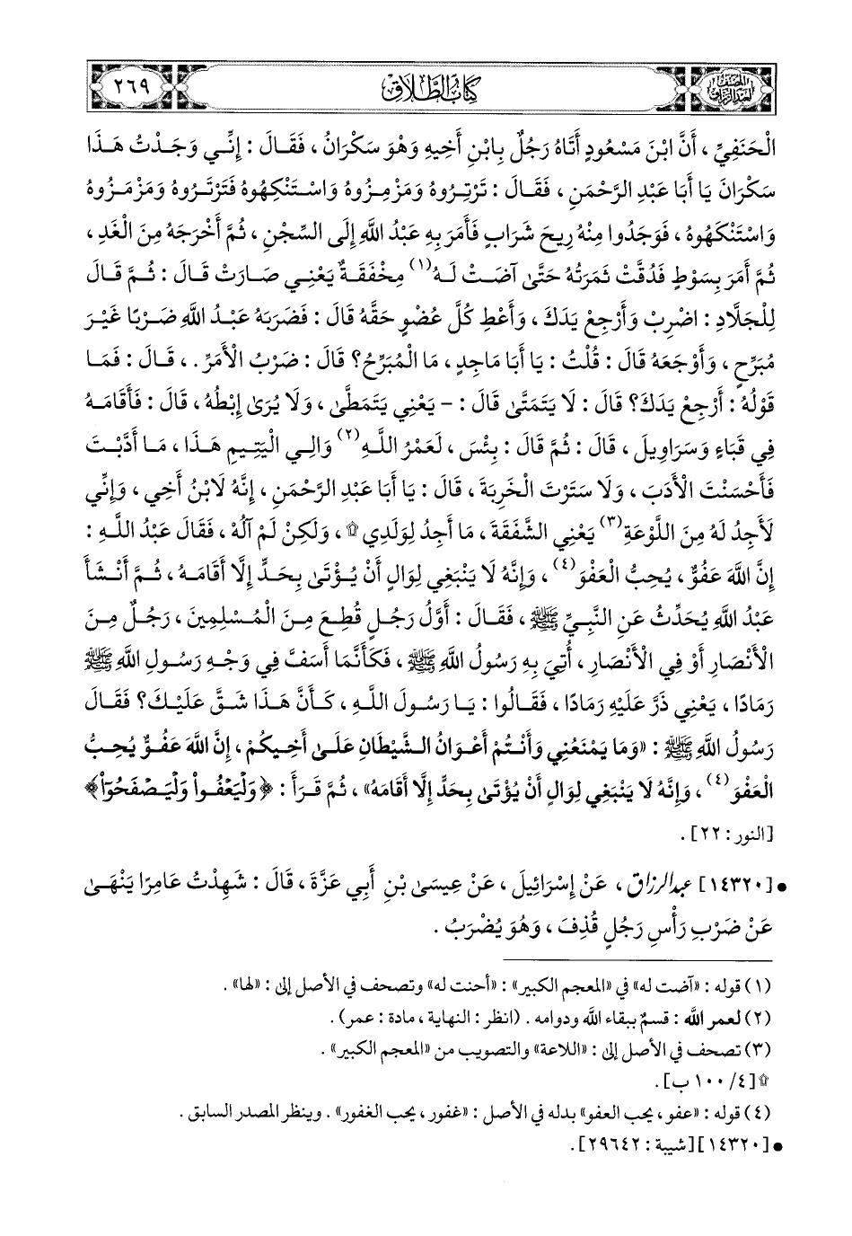 14320- عبد الرزاق، عَن إِسْرَائِيلَ، عَنْ عِيسَى بنِ أَبِي عَزَّةَ قَالَ: شَهِدْتُ عَامِرًا يَنْهَى عَن ضَرْبِ رَأْسِ رَجُلٍ قُذِفَ وَهُوَ يُضْرَبُ.