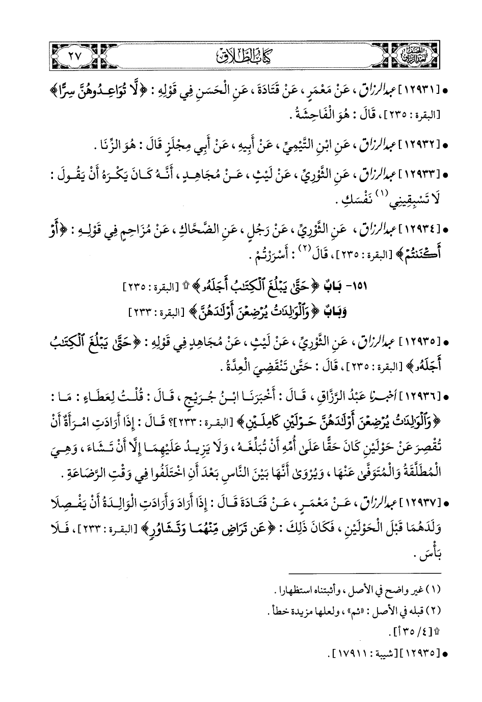 12936- أخبرنا عبد الرزاق، قَالَ: أَخْبَرَنَا ابْنُ جُرَيْجٍ، قَالَ: قُلْتُ لِعَطَاءٍ: مَا {وَالْوَالِدَاتُ يُرْضِعْنَ أَوْلاَدَهُنَّ حَوْلَيْنِ كَامِلَيْنِ}؟ قَالَ: إِذَا أَرَادَتِ امْرَأَةٌ أَنْ تُقْصِرَ عَن حَوْلَيْنِ كَانَ حَقًّا عَلَى أُمِّهِ أَنْ تُبَلِّغَهُ، وَلاَ يَزِيدُ عَلَيْهِمَا إِلاَّ أَنْ تَشَاءَ، وَهِيَ المُطَلَّقَةُ وَالمُتَوَفَّى عَنْهَا، وَيُرْوَى أَنَّهَا بَيْنَ النَّاسِ بَعْدَ أَنِ اخْتَلَفُوا فِي وَقْتِ الرَّضَاعَةِ.