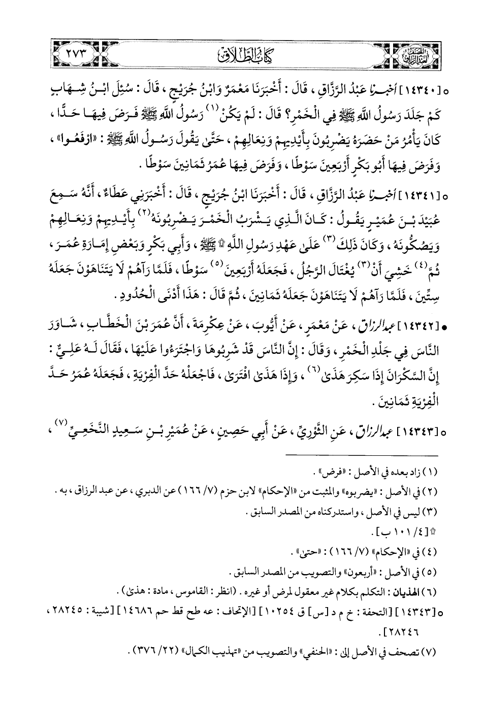 14340- أخبرنا عبد الرزاق، قَالَ: أَخْبَرَنَا مَعْمَرٌ، وَابْنُ جُرَيْجٍ، قَالَ: سُئِلَ ابْنُ شِهَابٍ: كَمْ جَلَدَ رَسُولُ اللهِ صَلَّى اللهُ عَلَيْهِ وَسَلَّمَ فِي الْخَمْرِ؟ قَالَ: لَمْ يَكُنْ رَسُولُ اللهِ صَلَّى اللهُ عَلَيْهِ وَسَلَّمَ فَرَضَ فِيهَا حَدًّا، كَانَ يَأْمُرُ مَنْ حَضَرَهُ يَضْرِبُونَ بِأَيْدِيهِمْ وَنِعَالِهِمْ، حَتَّى يَقُولَ رَسُولُ اللهِ صَلَّى اللهُ عَلَيْهِ وَسَلَّمَ: ارْفَعُوا، وَفَرَضَ فِيهَا أَبو بَكْرٍ أَرْبَعِينَ سَوْطًا، وَفَرَضَ فِيهَا عُمَرُ ثَمَانِينَ سَوْطًا.