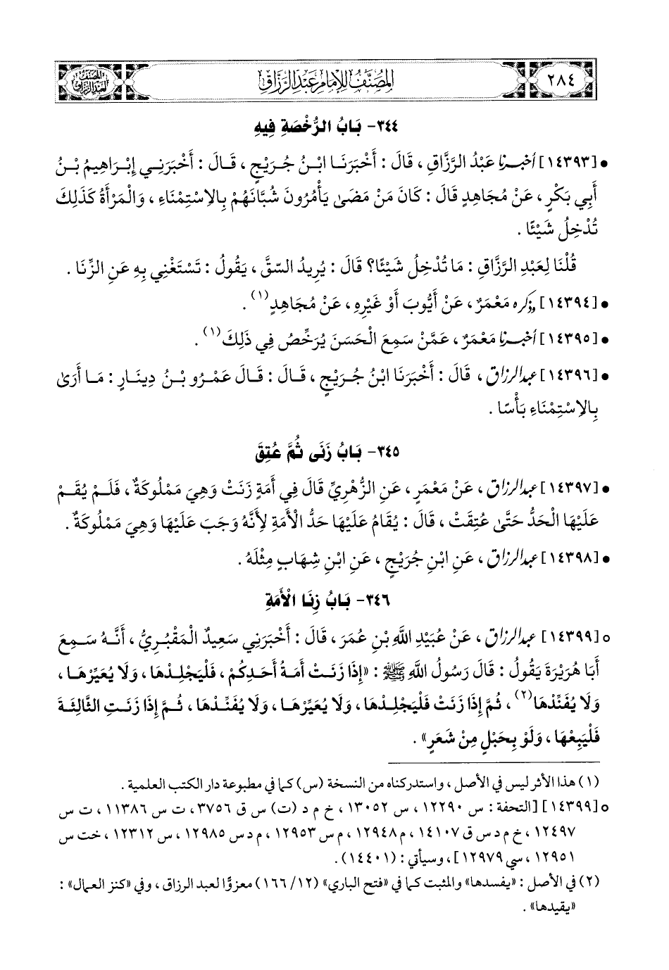 14393- أخبرنا عبد الرزاق، قَالَ: أَخْبَرَنَا ابْنُ جُرَيْجٍ، قَالَ: أَخْبَرَنِي إِبرَاهِيمُ بن أَبِي بَكْرٍ، عَن مُجاهِدٍ قَالَ: كَانَ مَنْ مَضَى يَأْمُرُونَ شُبَّانَهُمْ بِالاِسْتِمْنَاءِ، وَالمَرْأَةُ كَذَلِكَ تُدْخِلُ شَيْئًا. قُلْنَا لِعَبْدِ الرَّزَّاقِ: مَا تُدْخِلُ شَيْئًا؟ قَالَ: يُرِيدُ السق، يَقُولُ: تَسْتَغْنِي بِهِ عَنِ الزِّنَا.