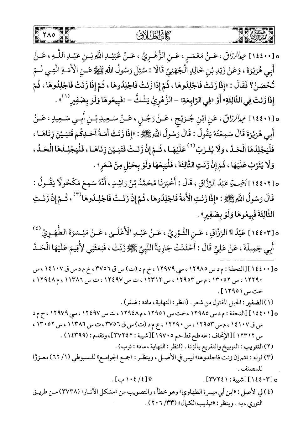 14403 - عبد الرزاق، عَنِ الثَّورِيِّ، عَنْ عَبدِ الأَعَلَى، عَنْ مَيْسَرَةَ الطُّهَوِيِّ أَبِي جَمِيلَةَ، عَنْ عَلِيٍّ، قَالَ: أَحْدَثَتْ جَارِيَةُ النَّبِيِّ صَلَّى اللهُ عَلَيْهِ وَسَلَّمَ، زَنَتْ، [فَبَعَثَنِي لأُقِيمَ عَلَيْهَا الْحَدَّ، فَوَجَدْتُهَا لَمْ تَجِفَّ مِنْ دَمِهَا، فَأَتَيْتُهُ، فَأَخْبَرْتُهُ، فَقَالَ النَّبِيِّ صَلَّى اللهُ عَلَيْهِ وَسَلَّمَ: إِذَا جَفَّتْ مِنْ دَمِهَا، فَأَقِمْ عَلَيْهَا الْحَدَّ، ثُمَّ قَالَ: أَقِيمُوا الْحُدُودَ عَلَى مَا مَلَكَتْ أَيْمَانُكُمْ] (1).