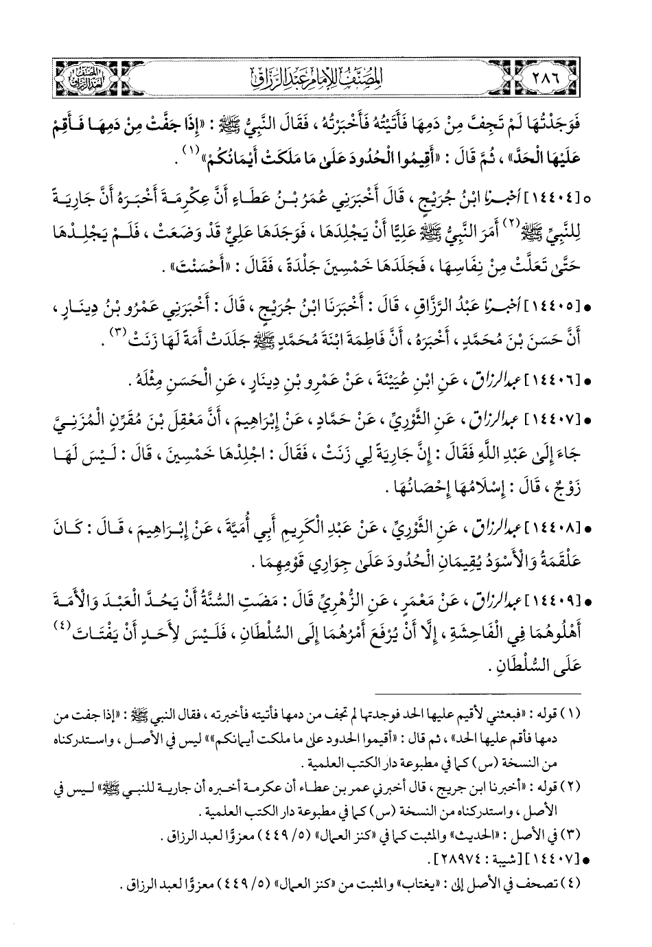 14405 - أخبرنا عبد الرزاق، قَالَ: أَخْبَرَنَا ابْنُ جُرَيْجٍ، قَالَ: أَخْبَرَنِي عَمْرُو بن دِينَارٍ، أَنَّ حَسَنَ بن مُحَمَّدٍ أَخْبَرَهُ، أَنَّ فَاطِمَةَ ابْنَةَ مُحَمَّدٍ صَلَّى اللهُ عَلَيْهِ وَسَلَّمَ جَلَدَتْ أَمَةً لَهَا زَنَتْ (1).