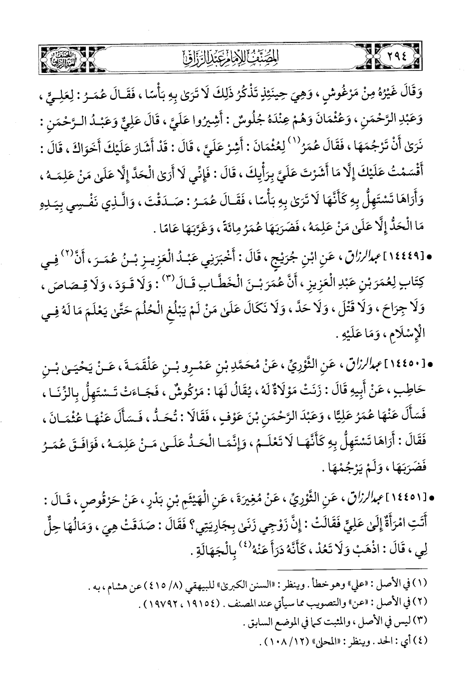 14450 - عبد الرزاق، عَنِ الثَّورِيِّ، عَن مُحَمَّدِ بْنِ عَمْرِو بنِ عَلْقَمَةَ، عَن يَحيَى بنِ حَاطِبٍ، عَنْ أَبِيهِ، قَالَ: زَنَتْ مَوْلاَةٌ لَهُ، يُقَالُ لَهَا: مَرْكُوشٌ، فَجَاءَتْ تَسْتَهِلُّ بِالزِّنَا، فَسَأَلَ عَنْهَا عُمَرُ عَلِيًّا، وَعَبْدَ الرَّحْمَنِ بن عَوْفٍ، فَقَالاَ: تُحَدُّ (1) فَسَأَلَ عَنْهَا عُثْمَانَ، فَقَالَ: أُرَاهَا تَسْتَهِلُّ بِهِ، كَأَنَّهَا لاَ تَعْلَمُ، وَإِنَّمَا الْحَدُّ عَلَى مَنْ عَلِمَهُ، فَوَافَقَ عُمَرُ، فَضَرَبَهَا، وَلَمْ يَرْجُمْهَا.