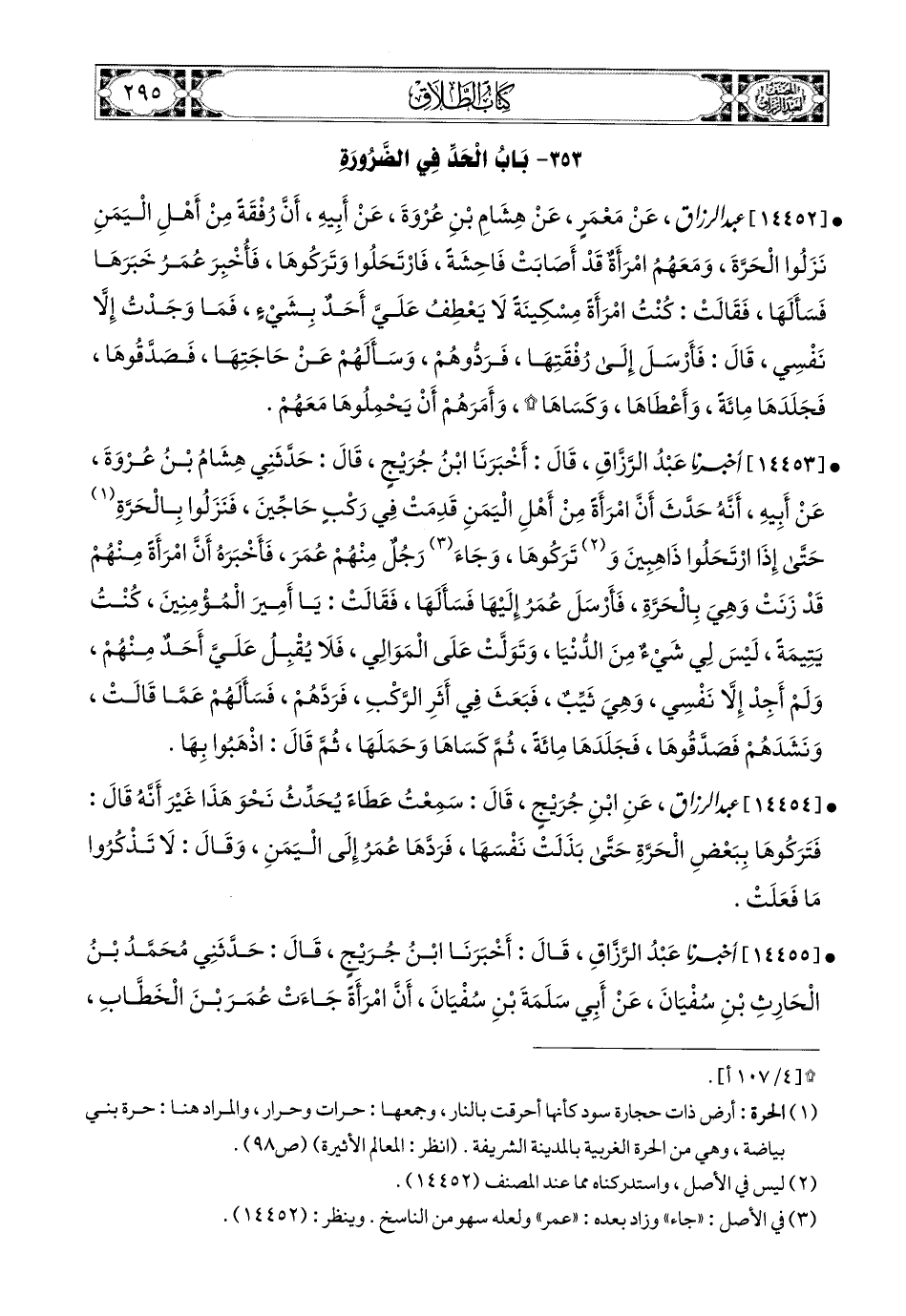 14453 - أخبرنا عبد الرزاق، قَالَ: أَخْبَرَنَا ابْنُ جُرَيْجٍ، قَالَ: حَدَّثَنِي هِشَامُ بن عُرْوَةَ، عَنْ أَبِيهِ، أَنَّهُ حَدَّثَ أَنَّ امْرَأَةً مِنْ أَهْلِ الَيَمَنِ قَدِمَتْ فِي رَكْبٍ حَاجِّينَ، فَنَزَلُوا بِالْحَرَّةِ، حَتَّى إِذَا ارْتَحَلُوا ذَاهِبِينَ وتَرَكُوهَا، جَاءَ رَجُلٌ مِنْهُمْ عُمَرَ، فَأَخْبَرَهُ أَنَّ امْرَأَةً مِنْهُمْ قَدْ زَنَتْ، وَهِيَ بِالْحَرَّةِ، فَأَرْسَلَ عُمَرُ إِلَيْهَا فَسَأَلَهَا، فَقَالَتْ: يَا أَمِيرَ المُؤْمِنِينَ، كُنْتُ يَتِيمَةً، لَيْسَ لِي شَيْءٌ مِنَ الدُّنْيَا وَتَوَلَّتْ (1) عَلَى المَوَالِي، فَلاَ يُقْبِلُ عَلَيَّ أَحَدٌ مِنْهُمْ، وَلَمْ أَجِدْ إِلاَّ نَفْسِي، وَهِيَ ثَيِّبٌ، فَبَعَثَ فِي أَثَرِ الرَّكْبِ، فَرَدَّهُمْ، فَسَأَلَهُمْ عَمَّا قَالَتْ، وَنَشَدَهُمْ (2) فَصَدَّقُوهَا، فَجَلَدَهَا مِئَةً، ثُمَّ كَسَاهَا وَحَمَلَهَا، ثُمَّ قَالَ: اذْهَبُوا بِهَا.