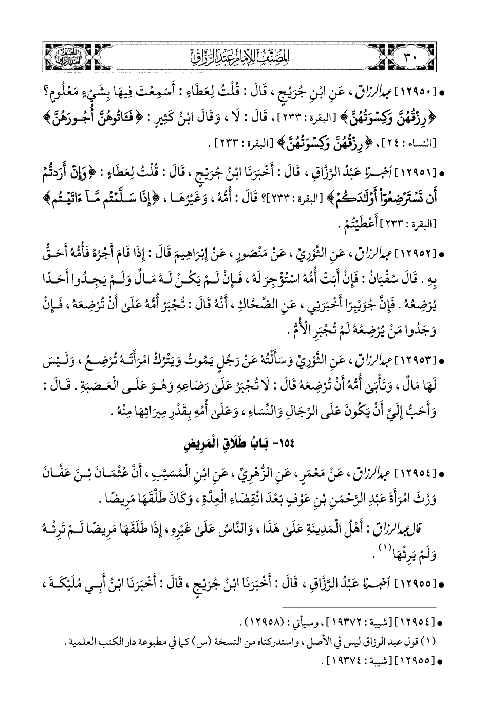 12950- عبد الرزاق، عَنِ ابْنِ جُرَيْجٍ، قَالَ: قُلْتُ لِعَطَاءٍ: أَسَمِعْتَ فِيهَا بِشَيْءٍ مَعْلُومٍ؟ {رِزْقُهُنَّ وَكِسْوَتُهُنَّ} قَالَ: لاَ، وَقَالَ ابْنُ كَثِيرٍ: {فَآتُوهُنَّ أُجُورَهُنَّ}: {رِزْقُهُنَّ وَكِسْوَتُهُنَّ}.