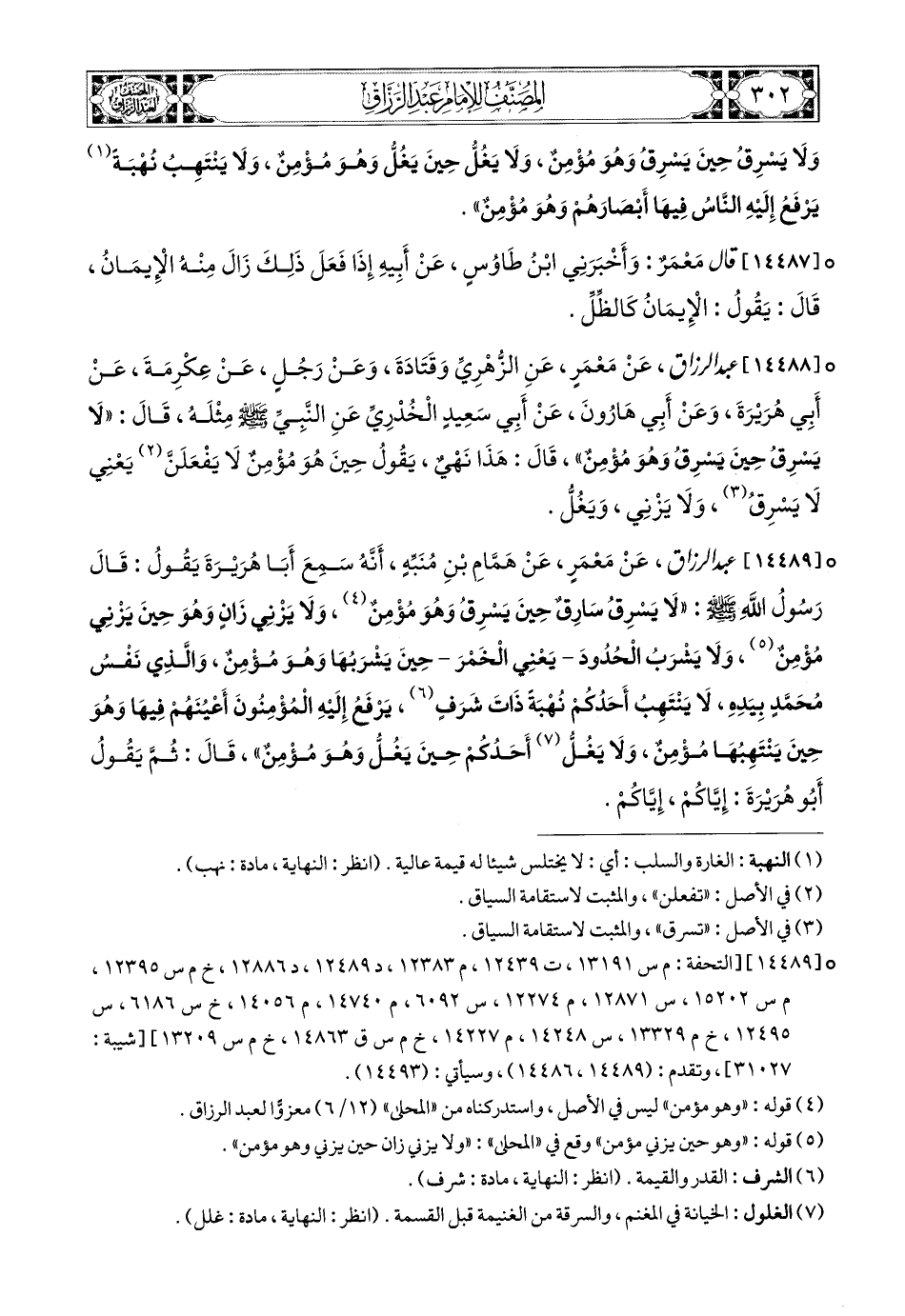 14489 - عبد الرزاق، عَنْ مَعْمَرٍ، عَن هَمَّامِ بْنِ مُنَبِّهٍ، أَنَّهُ سَمِعَ أَبَا هُرَيرَةَ يَقُولُ: قَالَ رَسُولُ اللهِ صَلَّى اللهُ عَلَيْهِ وَسَلَّمَ: لاَ يَسْرِقُ سَارِقٌ حِينَ يَسْرِقُ وَهُوَ مُؤْمِنٌ، وَلاَ يَزْنِي زَانٍ وَهُوَ حِينَ يَزْنِي مُؤْمِنٌ، وَلاَ يَشْرَبُ الْحُدُودَ، يَعْنِي الْخَمْرَ، حِينَ يَشْرَبُهَا وَهُوَ مُؤْمِنٌ، وَالَّذِي نَفْسُ مُحَمَّدٍ بِيَدِهِ، لاَ يَنْتَهِبُ أَحَدُكُمْ نُهْبَهً ذَاتَ شَرَفٍ، يَرْفَعُ إِلَيْهِ المُؤْمِنُونَ أَعْيُنَهُمْ فِيهَا وَهُوَ حِينَ يَنْتَهِبُهَا مُؤْمِنٌ، وَلاَ يَغُلُّ أَحَدُكُمْ حِينَ يَغُلُّ وَهُوَ مُؤْمِنٌ، قَالَ: ثُمَّ يَقُولُ أَبو هُرَيرَةَ: إِيَّاكُمْ، إِيَّاكُمْ.