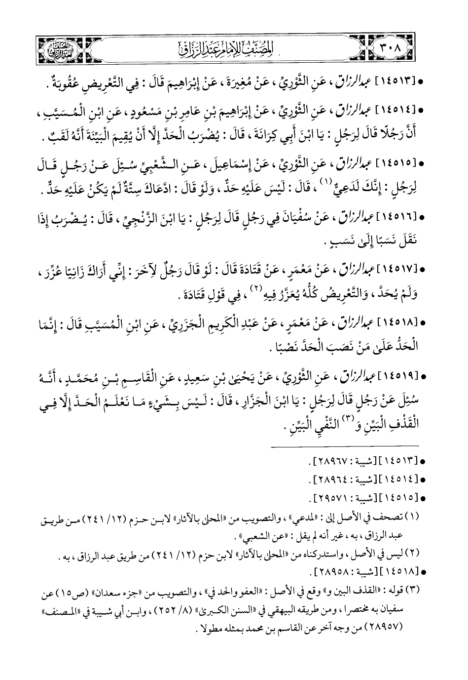 14513- عبد الرزاق، عَنِ الثَّورِيِّ، عَن مُغِيرَةَ، عَن إِبرَاهِيمَ، قَالَ: فِي التَّعْرِيضِ عُقُوبَةٌ.