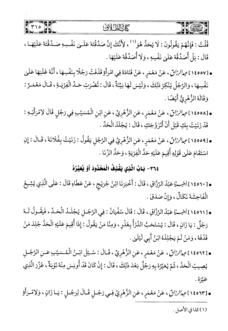 14559- عبد الرزاق، عَنْ مَعْمَرٍ، عَنِ الزُّهْرِيِّ، فِي الرَّجُلِ يَقُولُ: زَنَيْتُ بِفُلاَنةٍ، قَالَ: إِنِ اسْتَقَامَ عَلَى قَوْلِهِ أُقِيمَ عَلَيْهِ حَدُّ الْفِرْيَةِ، وَحَدُّ الزِّنَا.