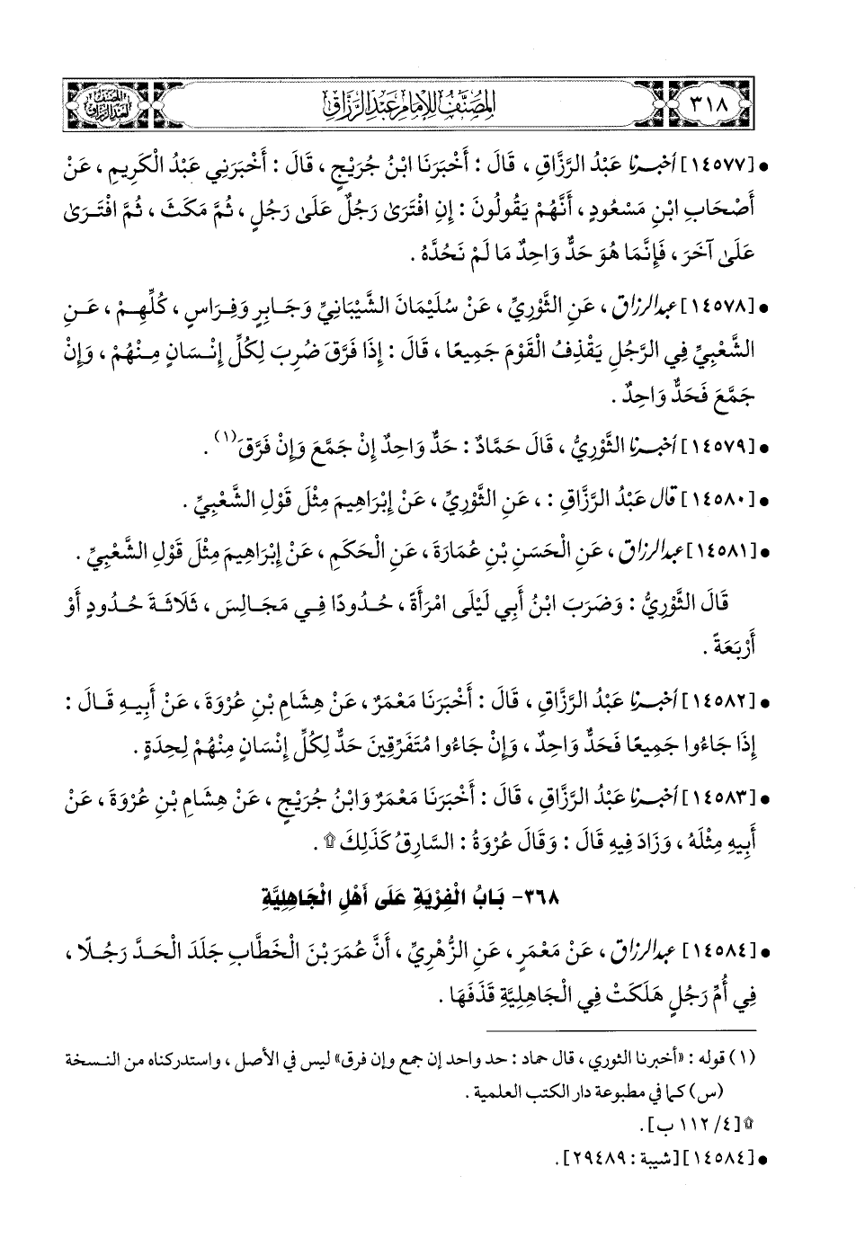 14578 - عبد الرزاق، عَنِ الثَّورِيِّ، عَن سُلَيْمَانَ الشَّيْبَانِيِّ، وَجَابِرٍ، وَفِرَاسٍ، كُلِّهِمْ عَنِ الشَّعْبِيِّ فِي الرَّجُلِ يَقْذِفُ الْقَوْمَ جَمِيعًا، قَالَ: إِذَا (1) فَرَّقَ ضُرِبَ لِكُلِّ إِنْسَانٍ مِنْهُمْ، وَإِنْ جَمَعَ فَحَدٌّ وَاحِدٌ.