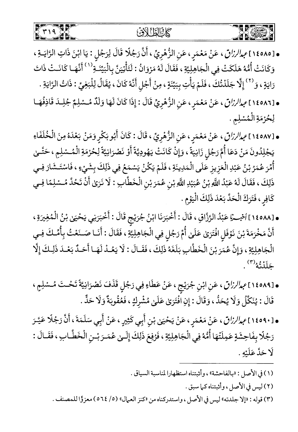 14588 - أخبرنا عبد الرزاق، قَالَ: أَخْبَرَنَا ابْنُ جُرَيْجٍ، قَالَ: أَخْبَرَنِي يَحيَى بن المُغِيرَةِ، أَنَّ مَخْرَمَةَ بن نَوْفَلٍ افْتَرَى عَلَى أُمِّ رَجُلٍ فِي الْجَاهِلِيَّةِ، فَقَالَ: أَنَا صَنَعْتُ بِأُمِّكَ فِي الْجَاهِلِيَّةِ، وَإِنَّ عُمَرَ بن الْخَطَّابِ بَلَغَهُ ذَلِكَ، فَقَالَ: لاَ يَعُدْ لَهَا أَحَدٌ بَعْدَ ذَلِكَ [إلاَّ جَلَدْته] (1).