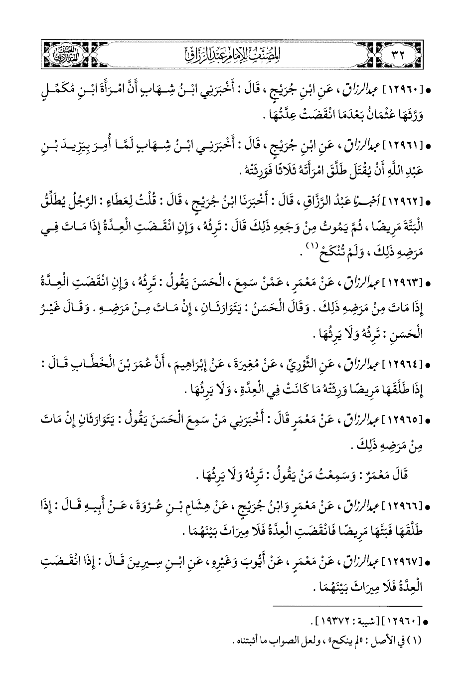 12961- عبد الرزاق، عَنِ ابْنِ جُرَيْجٍ، قَالَ: أَخْبَرَنِي ابْنُ شِهَابٍ، لَمَّا أُمِرَ بِيزِيدَ بْنِ عَبدِ اللهِ أَنْ يُقْتَلَ، طَلَّقَ امْرَأَتَهُ ثَلاَثًا فَوَرِثَتْهُ.