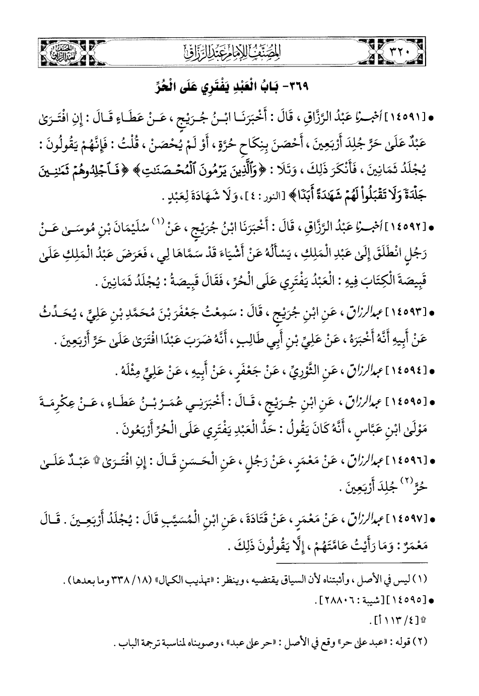 14591- أخبرنا عبد الرزاق، قَالَ: أَخْبَرَنَا ابْنُ جُرَيْجٍ، عَنْ عَطَاءٍ، قَالَ: إِنِ افْتَرَى عَبدٌ عَلَى حُرٍّ جُلِدَ أَرْبَعِينَ، أَحْصَنَ بِنِكَاحِ حُرَّةٍ، أَوْ لَمْ يُحْصَنْ. قُلْتُ: فَإِنَّهُمْ يَقُولُونَ: يُجْلَدُ ثَمَانِينَ، فَأَنْكَرَ ذَلِكَ، وَتَلاَ: {وَالَّذِينَ يَرْمُونَ المُحْصَنَاتِ}، {فَاجْلِدُوهُمْ ثَمَانِينَ جَلْدَةً وَلاَ تَقْبَلُوا لَهُمْ شَهَادَةً أَبَدًا} وَلاَ شَهَادَةَ لِعَبْدٍ.