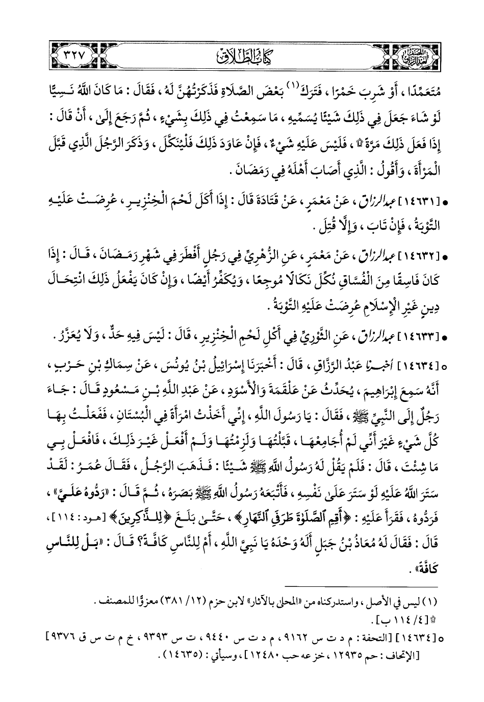 14631- عبد الرزاق، عَنْ مَعْمَرٍ، عَن قَتَادَةَ، قَالَ: إِذَا أَكَلَ لَحْمَ الْخِنْزِيرِ عُرِضَتْ عَلَيْهِ التَّوْبَةُ، فَإِنْ تَابَ، وَإِلاَّ قُتِلَ.