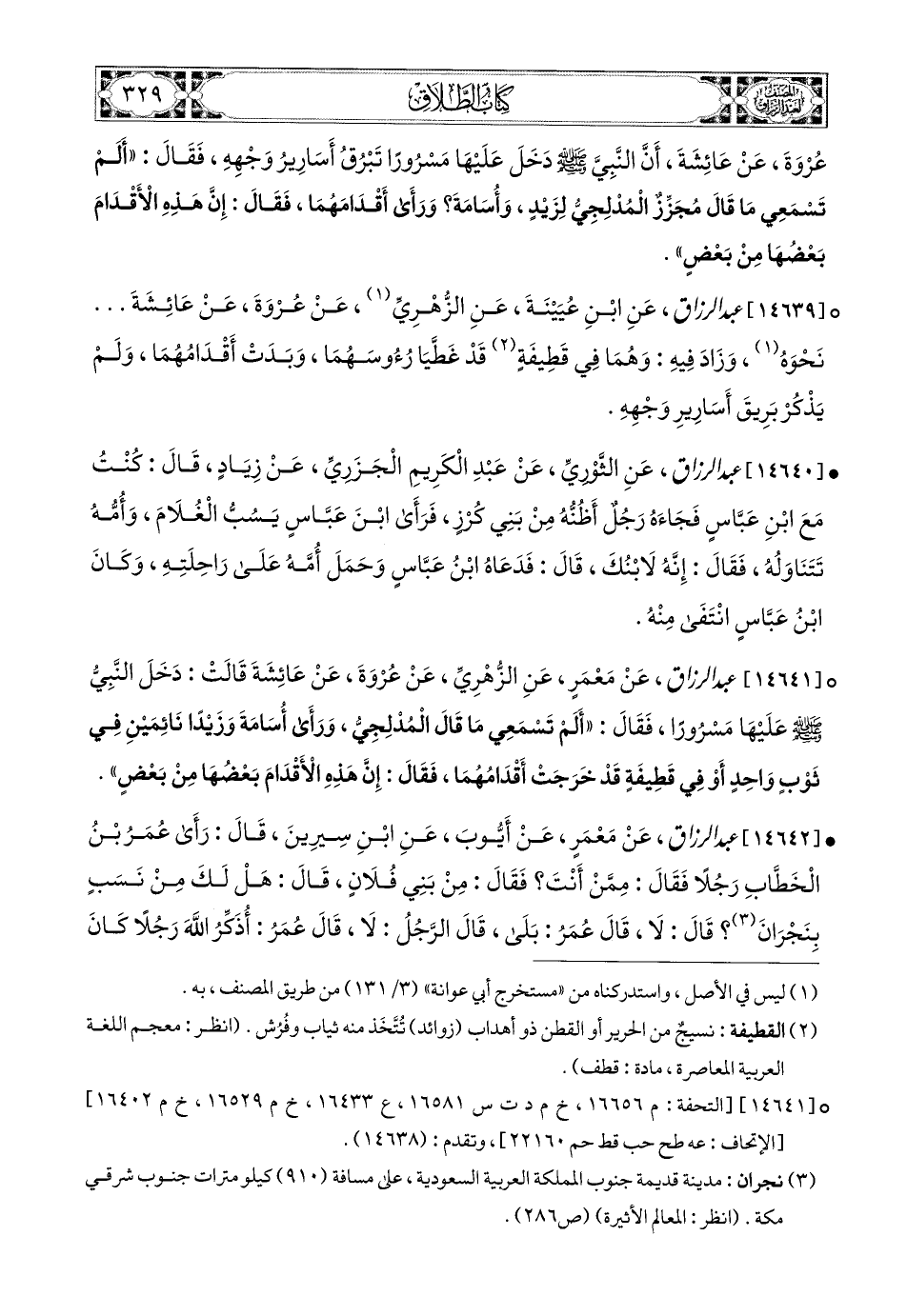 14639- عبد الرزاق، عَنِ ابْنِ عُيَيْنَةَ، عَنِ الزُّهْرِيِّ، عَن عُرْوَةَ، عَنْ عَائِشَةَ، نَحْوَهُ، وَزَادَ فِيهِ: وَهُمَا فِي قَطِيفَةٍ، قَدْ غَطَّيَا رُؤُوسَهُمَا، وَبَدَتْ أَقْدَامُهُمَا، وَلَمْ يَذْكُرْ بَرِيقَ أَسَارِيرِ وَجْهِهِ.