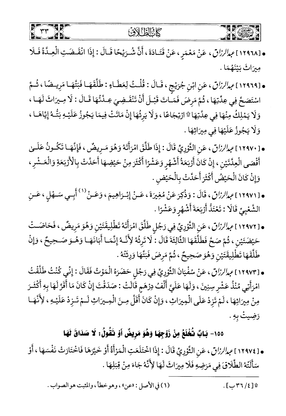 12974- عبد الرزاق، عَنِ الثَّورِيِّ، قَالَ: إِذَا اخْتَلَعَتِ المَرْأَةُ، أَوْ خَيَّرَهَا، فَاخْتَارَتْ نَفْسَهَا، أَوْ سَأَلَتْهُ الطَّلاَقَ فِي مَرَضِهِ فَلاَ مِيرَاثَ لَهَا، لأَنَّهُ جَاءَ مِنْ قِبَلِهَا.