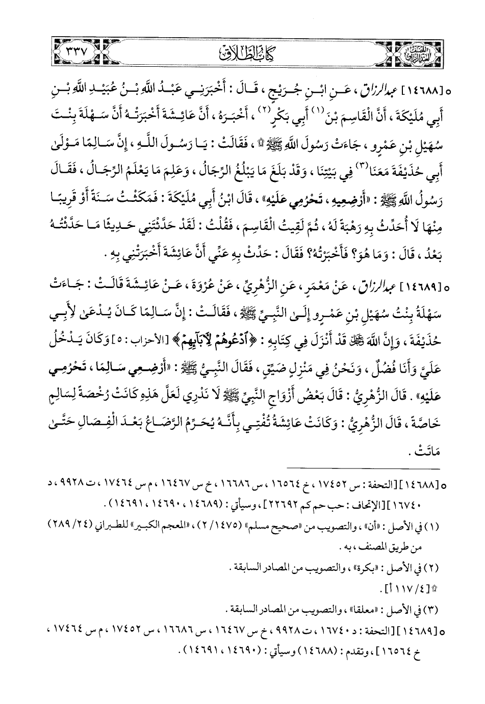 14688 - عبد الرزاق، عَنِ ابْنِ جُرَيْجٍ، قَالَ: أَخْبَرَنِي عَبدُ اللهِ بن عُبَيْدِ اللهِ بْنِ أَبِي مُلَيْكَةَ، أَنَّ الْقَاسِمَ بْنَ أَبِي بَكْرٍ (1) أَخْبَرَهُ، أَنَّ عَائِشَةَ أَخْبَرَتْهُ، أَنَّ سَهْلَةَ بِنْتَ سُهَيْلِ بْنِ عَمْرٍو جَاءَتْ رَسُولَ اللهِ صَلَّى اللهُ عَلَيْهِ وَسَلَّمَ، فَقَالَتْ: يَا رَسُولَ اللهِ، إِنَّ سَالِمًا، مَوْلَى أَبِي حُذَيْفَةَ مَعَنَا فِي بَيْتِنَا، وَقَدْ بَلَغَ مَا يَبْلُغُ الرِّجَالُ، وَعَلِمَ مَا يَعْلَمُ الرِّجَالُ، فَقَالَ رَسُولُ اللهِ صَلَّى اللهُ عَلَيْهِ وَسَلَّمَ: أَرْضِعِيهِ تَحْرُمِي عَلَيْهِ. قَالَ ابْنُ أَبِي مُلَيْكَةَ: فَمَكَثْتُ سَنَةً، أَوْ قَرِيبًا مِنْهَا، لاَ أُحَدِّثُ بِهِ، رَهْبَةً لَهُ، ثُمَّ لَقِيتُ الْقَاسِمَ، فَقُلْتُ: لَقَدْ حَدَّثَتْنِي حَدِيثًا مَا حَدَّثَتْهُ بَعْدُ، قَالَ: وَمَا هُوَ؟ فَأَخْبَرْتُهُ؟ فَقَالَ: حَدِّثْ بِهِ عَنِّي أَنَّ عَائِشَةَ أَخْبَرْتِنِي بِهِ.