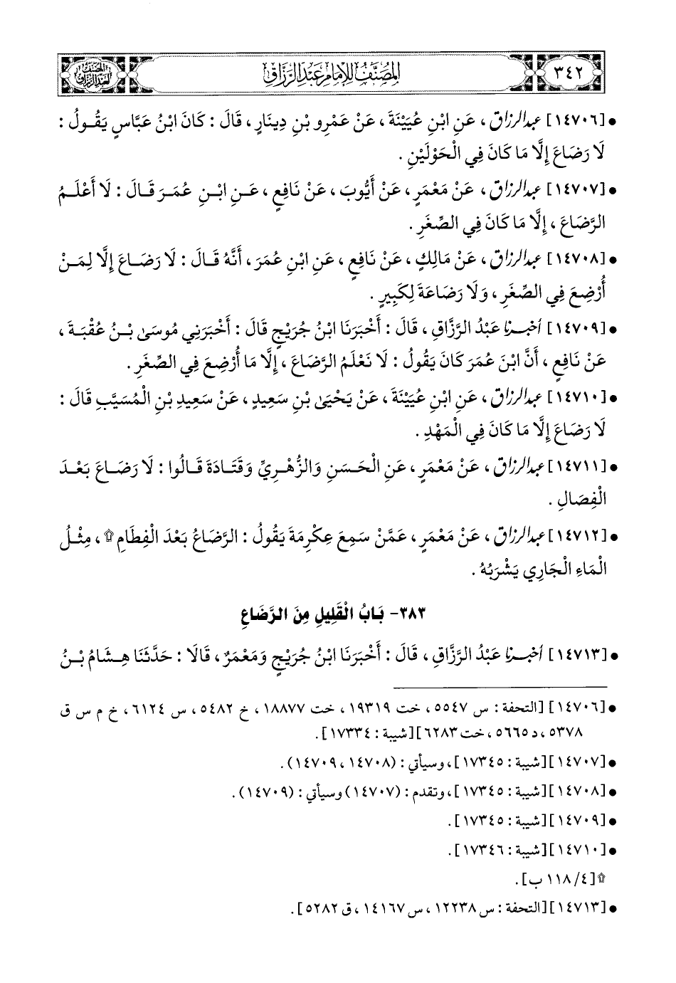 14706- عبد الرزاق، عَنِ ابْنِ عُيَيْنَةَ، عَنْ عَمْرِو بنِ دِينَارٍ قَالَ: كَانَ ابْنُ عَبَّاسٍ يَقُولُ: لاَ رَضَاعَ إِلاَّ مَا كَانَ فِي الْحَوْلَيْنِ.