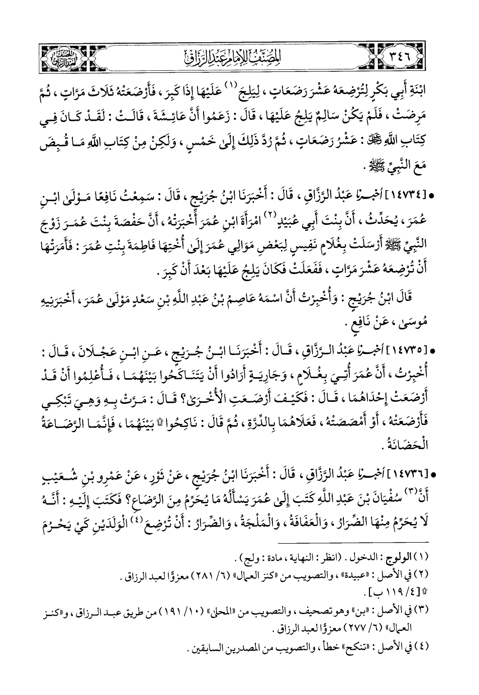 14734 - أخبرنا عبد الرزاق، قَالَ: أَخْبَرَنَا ابْنُ جُرَيْجٍ، قَالَ: سمعتُ نافعا، مولى ابن عمر يُحَدِّثُ؛ أن بِنْتَ (1) أبي عبيد، امرأة ابن عمر أخبرته، أن حفصة بِنْتَ عمر، زوج النبي صَلَّى اللهُ عَلَيْهِ وَسَلَّمَ أرسلت بغلام نفيس لبعض موالي عمر إِلَى أختها فاطمة بِنْتَ عمر، فأمرتها أن ترضعه عشر مرات، فَفَعَلَتْ، فكان يلج عليها بعد أن كبر.