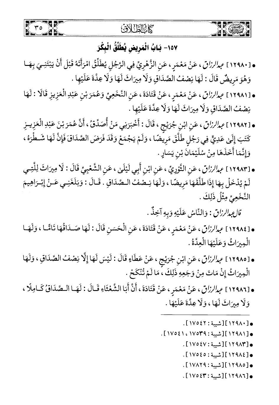 12980- عبد الرزاق، عَنْ مَعْمَرٍ، عَنِ الزُّهْرِيِّ، فِي الرَّجُلِ يُطَلِّقَ امْرَأَتَهُ قَبْلَ أَنْ يَبْتَنِيَ بِهَا وَهُوَ مَرِيضٌ، قَالَ: لَهَا نِصْفُ الصَّدَاقِ، وَلاَ مِيرَاثَ لَهَا، وَلاَ عِدَّةَ عَلَيْهِا.