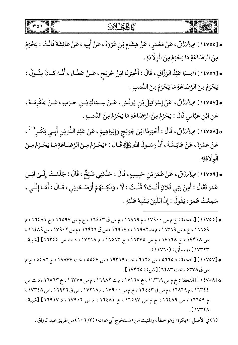 14756- أخبرنا عبد الرزاق، قَالَ: أَخْبَرَنَا ابْنُ جُرَيْجٍ، عَنْ عَطَاءٍ، أَنَّهُ كَانَ يَقُولُ: يَحْرُمُ مِنَ الرَّضَاعَةِ مَا يَحْرُمُ مِنَ النَّسَبِ.