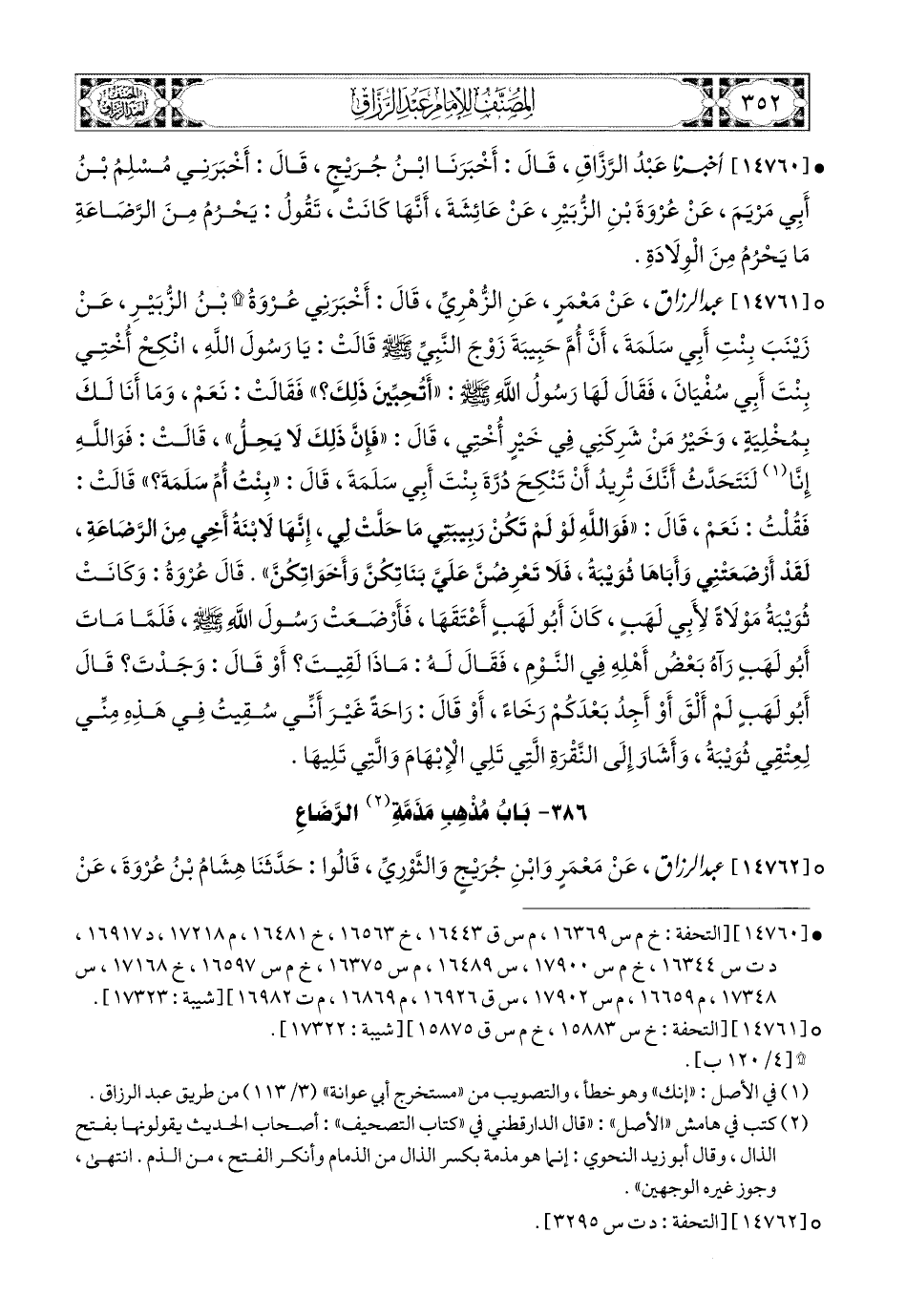 14761 - عبد الرزاق، عَنْ مَعْمَرٍ، عَنِ الزُّهْرِيِّ، قَالَ: أَخْبَرَنِي عُرْوَةُ بن الزُّبَيْرِ، عَن زَيْنَبَ بِنْتِ أَبِي سَلَمَةَ، أَنَّ أُمَّ حَبِيبَةَ، زَوْجَ النَّبِيِّ صَلَّى اللهُ عَلَيْهِ وَسَلَّمَ قَالَتْ: يَا رَسُولَ اللهِ، انْكِحْ أُخْتِي بنت (1) أَبِي سُفْيَانَ. فَقَالَ لَهَا رَسُولُ اللهِ صَلَّى اللهُ عَلَيْهِ وَسَلَّمَ: أَتُحِبِّينَ ذَلِكَ؟ فَقَالَتْ: نَعَمْ، وَمَا أَنَا لَكَ بِمُخْلِيَةٍ، وَخَيْرُ مَنْ شَرَكَنِي فِي خَيْرٍ أُخْتِي، قَالَ: فَإِنَّ ذَلِكَ لاَ يَحِلُّ. قَالَتْ: فَوَاللهِ إِنَّا لَنَتَحَدَّثُ أَنَّكَ تُرِيدُ أَنْ تَنْكِحَ دُرَّةَ بِنْتَ أَبِي سَلَمَةَ، قَالَ: بنت (1) أُمِّ سَلَمَةَ؟ قَالَتْ: فَقُلْتُ: نَعَمْ. قَالَ: فَوَاللهِ لَوْ لَمْ تَكُنْ رَبِيبَتِي مَا حَلَّتْ لِي، إِنَّهَا لاَبْنَةُ أَخِي مِنَ الرَّضَاعَةِ، لَقَدْ أَرْضَعَتْنِي وَأَبَاهَا ثُوَيْبَةُ، فَلاَ تَعْرِضُنَّ عَلَيَّ بَنَاتِكُنَّ وَأَخَوَاتِكُنَّ.