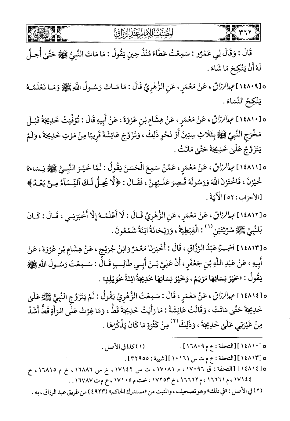 14814- عبد الرزاق، عَنْ مَعْمَرٍ، قَالَ: سَمِعْتُ الزُّهْرِي يَقُولُ: لَمْ يَتَزَوَّجِ النَّبِيُّ صَلَّى اللهُ عَلَيْهِ وَسَلَّمَ عَلَى خَدِيجَةَ حَتَّى مَاتَتْ، وَقَالَتْ عَائِشَةُ: مَا رَأَيْتُ خَدِيجَةَ قَطُّ، وَمَا غِرْتُ عَلَى امْرَأَةٍ قَطُّ أَشَدَّ مِنْ غَيْرَتِي عَلَى خَدِيجَةَ، وَذَلِكَ مِنْ كَثْرَةِ مَا كَانَ يَذْكُرُهَا.