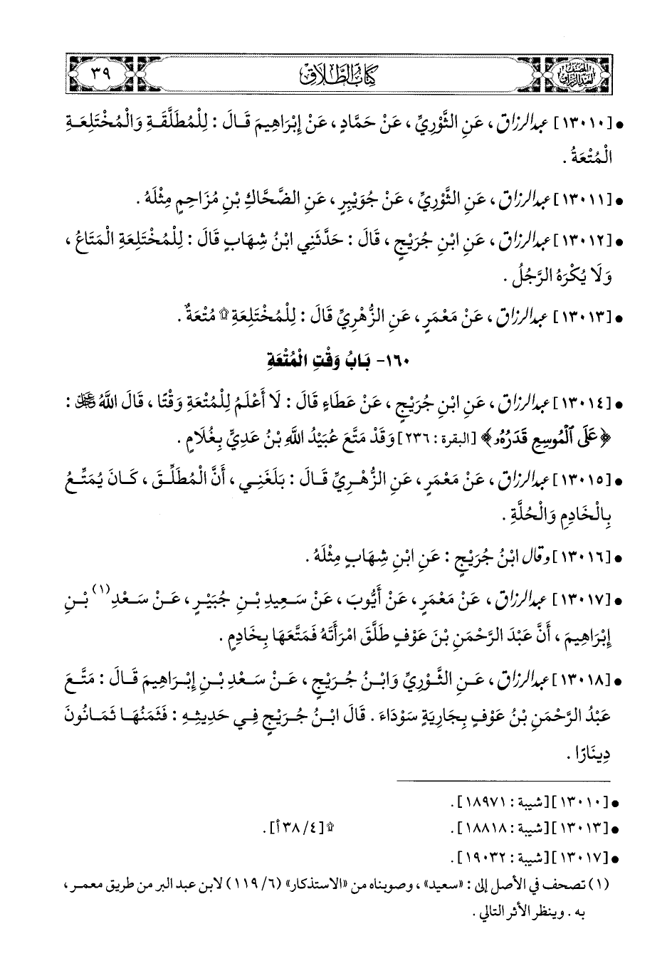13017- عبد الرزاق، عَنْ مَعْمَرٍ، عَنْ أَيُّوبَ، عَن سَعيدِ بْنِ جُبَيرٍ، عَن سَعْدِ بْنِ إِبرَاهِيمَ، أَنَّ عَبدَ الرَّحْمَنِ بن عَوْفٍ طَلَّقَ امْرَأَتَهُ، فَمَتَّعَهَا بِخَادِمٍ.