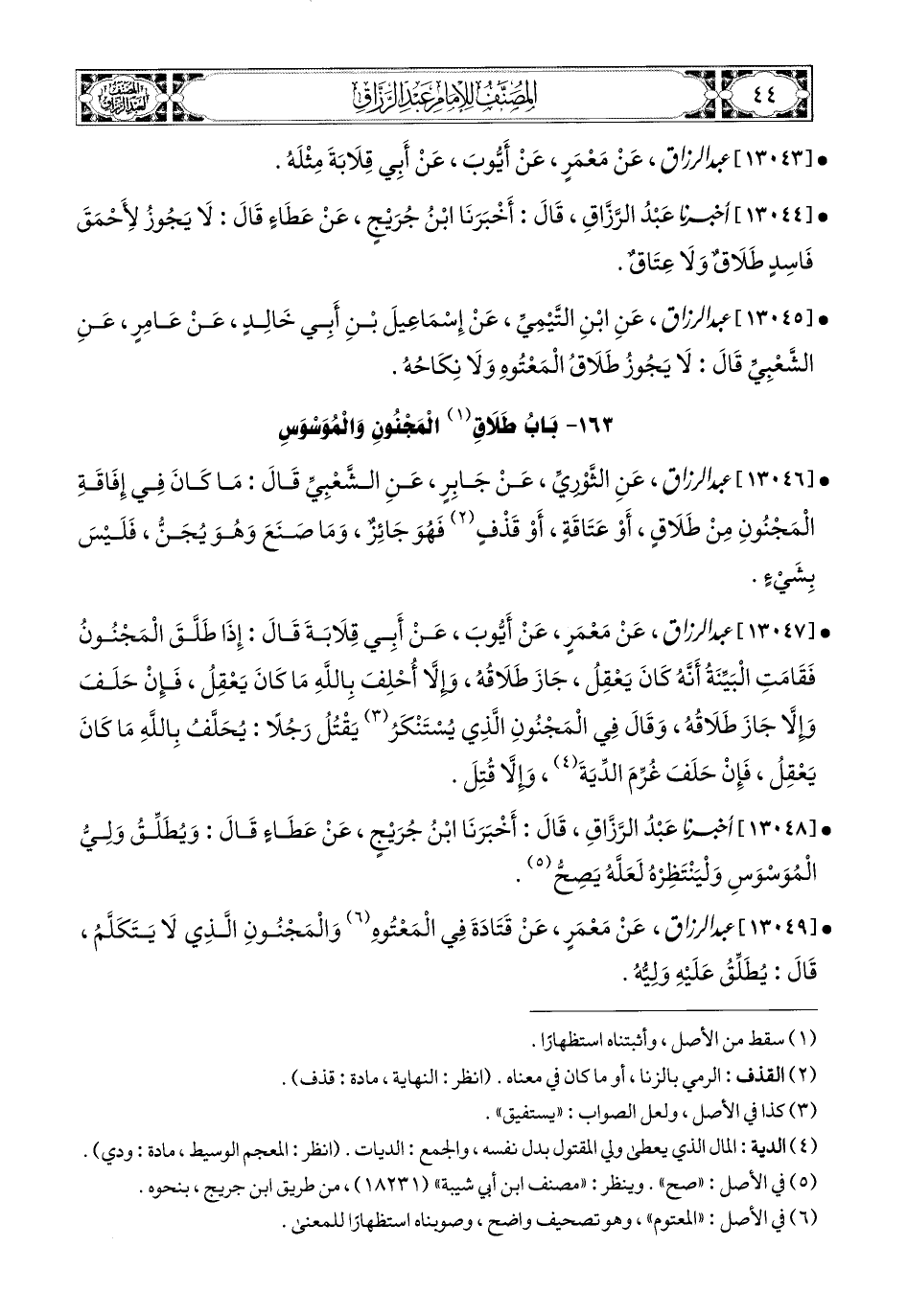 13046- عبد الرزاق، عَنِ الثَّورِيِّ، عَن جَابِرٍ، عَنِ الشَّعْبِيِّ، قَالَ: مَا كَانَ فِي إِفَاقَةِ المَجْنُونِ مِنْ طَلاَقٍ، أَوْ عَتَاقَةٍ، أَوْ قَذْفٍ فَهُوَ جَائِزٌ، وَمَا صَنَعَ وَهُوَ يُجَنُّ، فَلَيْسَ بِشَيْءٍ.