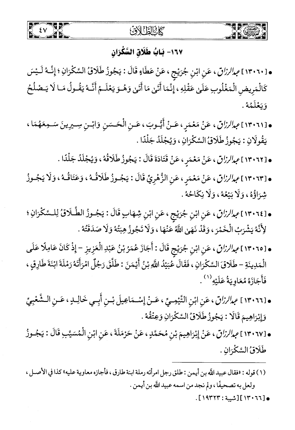 13065- عبد الرزاق، عَنِ ابْنِ جُرَيْجٍ، قَالَ: أَجَازَ عُمَرُ بن عَبدِ الْعَزِيزِ إِذْ كَانَ عَامِلاً عَلَى المَدِينَةِ طَلاَقَ السَّكْرَانِ، فَقَالَ عُبَيْدُ اللهِ بن أَيْمَنَ: طَلَّقَ رَجُلٌ امْرَأَتَهُ رَمْلَةَ ابْنَةَ طَارِقٍ، فَأَجَازَهُ مُعَاوِيَةُ عَلَيْهِ.