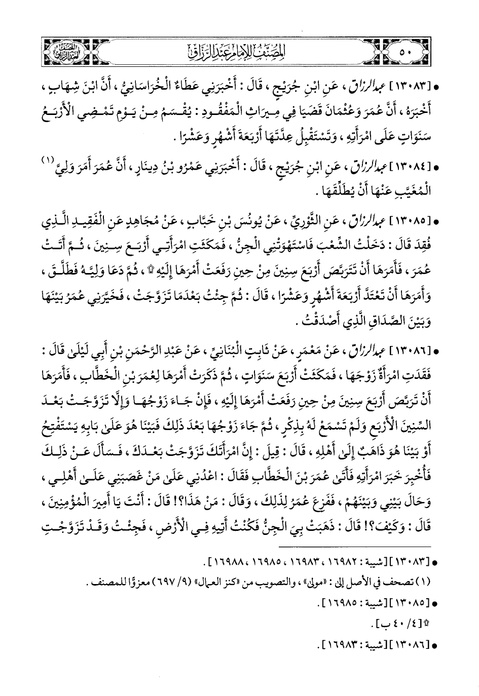 13086- عبد الرزاق، عَنْ مَعْمَرٍ، عَن ثَابِتٍ الْبُنَانِيِّ، عَنْ عَبدِ الرَّحْمَنِ بْنِ أَبِي لَيْلَى قَالَ: فَقَدَتِ امْرَأَةٌ زَوْجَهَا، فَمَكَثَتْ أَرْبَعَ سَنَوَاتٍ، ثُمَّ ذَكَرَتْ أَمْرَهَا لِعُمَرَ بْنِ الْخَطَّابِ، فَأَمَرَهَا أَنْ تَرَبَّصَ أَرْبَعَ سِنِينَ، مِنْ حِينِ رَفَعَتْ أَمْرَهَا إِلَيْهِ، فَإِنْ جَاءَ زَوْجُهَا وَإِلاَّ تَزَوَّجَتْ بَعْدَ السِّنِينَ (1) الأَرْبَعِ، وَلَمْ تَسْمَعْ لَهُ بِذِكْرٍ، ثُمَّ جَاءَ زَوْجُهَا بَعْدَ ذَلِكَ، فَبَيْنَا هُوَ عَلَى بَابِهِ يَسْتَفْتِحُ، أَوْ بَيْنَا هُوَ ذَاهِبٌ إِلَى أَهْلِهِ، قَالَ قِيلَ (2): إِنَّ امْرَأَتَكَ تَزَوَّجَتْ بَعْدَكَ، فَسَأَلَ عَن ذَلِكَ، فَأُخْبِرَ خَبَرَ امْرَأَتِهِ، فَأَتَى عُمَرَ بن الْخَطَّابِ، فَقَالَ: اعْدُنِي عَلَى مَنْ غَصَبَنِي عَلَى أَهْلِي، وَحَالَ بَيْنِي وَبَيْنَهُمْ، فَفَزِعَ عُمَرُ لَذَلِكَ، وَقَالَ: مَنْ هَذَا؟ قَالَ: أَنْتَ يَا أَمِيرَ المُؤْمِنِينَ. قَالَ: وَكَيْفَ؟ قَالَ: ذَهَبَتْ بِيَ الْجِنُّ، فَكُنْتُ أَتِيهُ فِي الأَرْضِ، فَجِئْتُ، وَقَدْ تَزَوَّجَتِ امْرَأَتِي، زَعَمُوا أَنَّكَ أَمَرْتَهَا بِذَلِكَ. قَالَ عُمَرُ: إِنْ شِئْتَ رَدَدْنَا إِلَيْكَ امْرَأَتَكَ، وَإِنْ شِئْتَ زَوَّجْنَاكَ غَيْرَهَا. قَالَ: بَل زَوِّجْنِي غَيْرَهَا، فَجَعَلَ عُمَرُ يَسْأَلُهُ عَنِ الْجِنِّ وَهُوَ يُخْبِرُهُ.