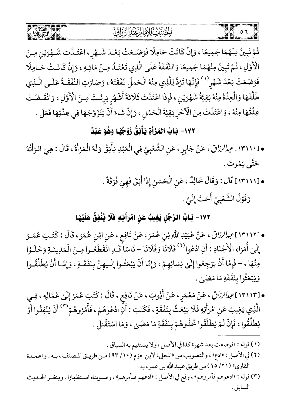 13112- عبد الرزاق، عَن عُبَيْدِ اللهِ بْنِ عُمَرَ، عَن نَافِعٍ، عَنِ ابْنِ عُمَرَ، قَالَ: كَتَبَ عُمَرُ إِلَى أُمَرَاءِ الأَجْنَادِ: أَنِ ادْعُ فَلاَنًا وَفُلاَنًا نَاسًا قَدِ انْقَطَعُوا مِنَ المَدِينَةِ وَخَلَوْا مِنْهَا، فَإِمَّا أَنْ يَرْجِعُوا إِلَى نِسَائِهِمْ، وَإِمَّا أَنْ يَبْعَثُوا إِلَيْهِنَّ بِنَفَقَةٍ، وَإِمَّا أَنْ يُطَلِّقُوا وَيَبْعَثُوا بِنَفَقَةِ مَا مَضَى.