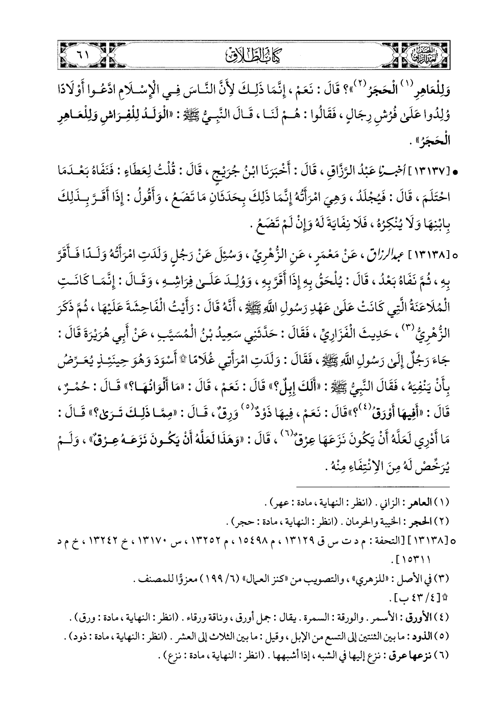 13138- عبد الرزاق، عَنْ مَعْمَرٍ، عَنِ الزُّهْرِيِّ، وَسُئِلَ عَن رَجُلٍ وَلَدَتِ امْرَأَتُهُ وَلَدًا فَأَقَرَّ بِهِ، ثُمَّ نَفَاهُ بَعْدُ، قَالَ: يُلْحَقُ بِهِ إِذَا أَقَرَّ بِهِ وَوُلِدَ عَلَى فِرَاشِهِ، وَقَالَ: إِنَّمَا كَانَتِ المُلاَعَنَةُ الَّتِي كَانَتْ عَلَى عَهْدِ رَسُولِ اللهِ صَلَّى اللهُ عَلَيْهِ وَسَلَّمَ، أَنَّهُ قَالَ: رَأَيْتُ الْفَاحِشَةَ عَلَيْهَا. ثُمَّ ذَكَرَ الزُّهْرِيُّ حَدِيثَ الْفَزَارِيِّ. فَقَالَ: حَدَّثَنِي سَعيدُ بن المُسَيَّبِ، عَنْ أَبِي هُرَيرَةَ، قَالَ: جَاءَ رَجُلٌ إِلَى رَسُولِ اللهِ صَلَّى اللهُ عَلَيْهِ وَسَلَّمَ فَقَالَ: وَلَدَتِ امْرَأَتِي غُلاَمًا أَسْوَدَ، وَهُوَ حِينَئِذٍ يُعَرِّضُ بِأَنْ يَنْفِيَهُ، فَقَالَ النَّبِيُّ صَلَّى اللهُ عَلَيْهِ وَسَلَّمَ: أَلَكَ إِبِلٌ؟ قَالَ: نَعَمْ. قَالَ: مَا أَلَوْانُهَا؟ قَالَ: حُمْرٌ. قَالَ: أَفِيهَا أَوْرَقُ؟ قَالَ: نَعَمْ، فِيهَا ذَوْدٌ وُرْقٌ. قَالَ: مِمَّا ذَلِكَ تَرَى؟ قَالَ: مَا أَدْرِي لَعَلَّهُ أَنْ يَكُونَ نَزَعَهَا عِرْقٌ. قَالَ: وَهَذَا لَعَلَّهُ أَنْ يَكُونَ نَزَعَهُ عِرْقٌ. وَلَمْ يُرَخِّصْ لَهُ مِنَ الاِنْتِفَاءِ مِنْهُ.