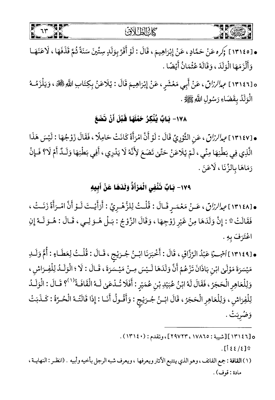 13149- أخبرنا عبد الرزاق، قَالَ: أَخْبَرَنَا ابْنُ جُرَيْجٍ، قَالَ: قُلْتُ لِعَطَاءٍ: أُمُّ وَلَدِ مَيْسَرَةَ، مَوْلَى ابْنِ بَاذَانَ (1) تَزْعُمُ أَنَّ وَلَدَهَا لَيْسَ مِنْ مَيْسَرَةَ، قَالَ: لاَ [تصدق] (2)، الْوَلَدُ لِلْفِرَاشِ، وَلِلْعَاهِرِ الْحَجَرُ. فَقَالَ لَهُ ابْنُ عُبَيْدِ بْنِ عُمَيْرٍ: أَفَلاَ تُدْعَى لَهُ الْقَافَةُ؟ قَالَ: الْوَلَدُ لِلْفِرَاشِ، وَلِلْعَاهِرِ الْحَجَرُ.