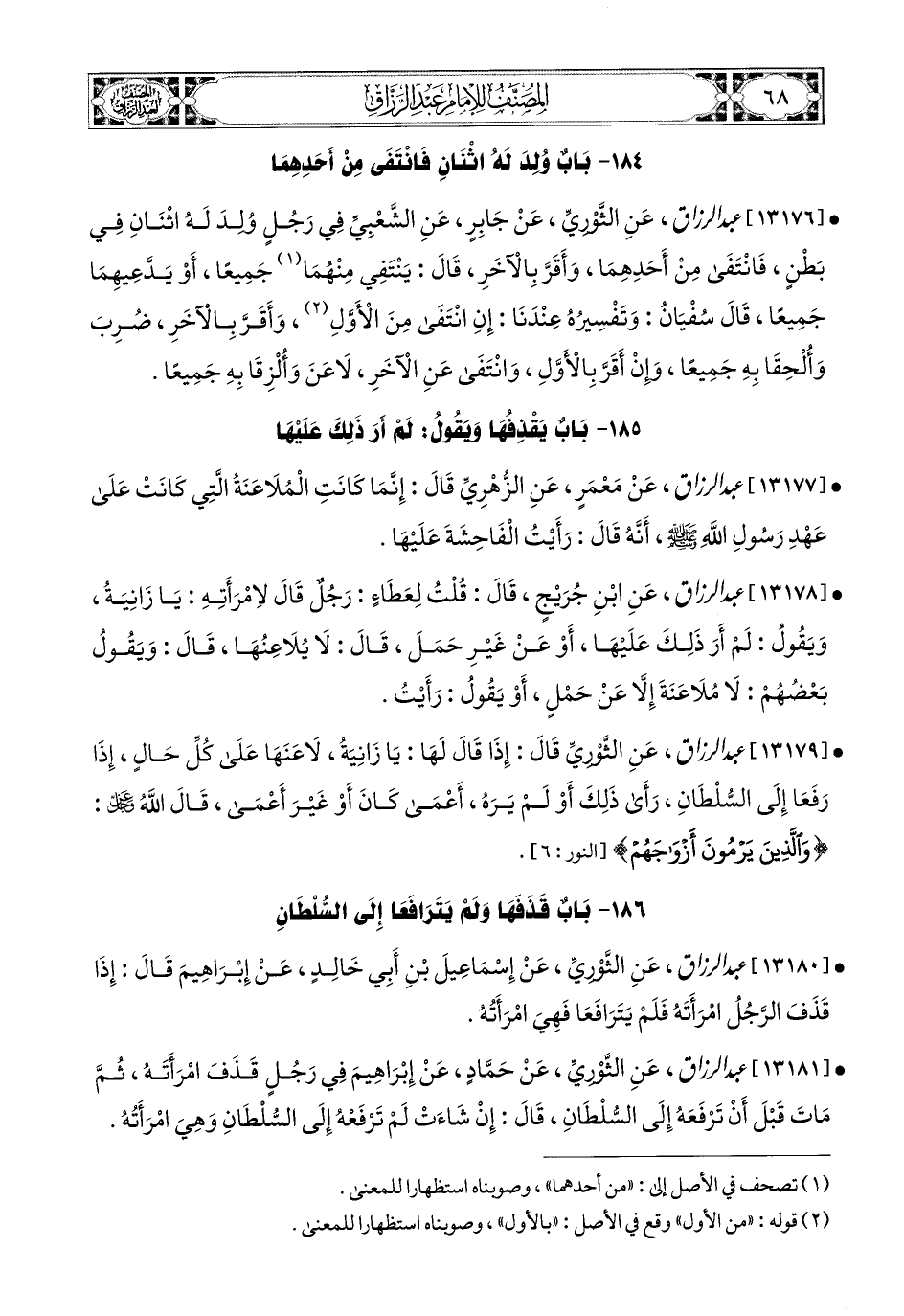 13181- عبد الرزاق، عَنِ الثَّورِيِّ، عَن حَمَّادٍ، عَن إِبرَاهِيمَ؛ فِي رَجُلٍ قَذَفَ امْرَأَتَهُ، ثُمَّ مَاتَ (1) قَبْلَ أَنْ تَرْفَعَهُ إِلَى السُّلْطَانِ قَالَ: إِنْ شَاءَتْ لَمْ تَرْفَعْهُ إِلَى السُّلْطَانِ وَهِيَ امْرَأَتُهُ.