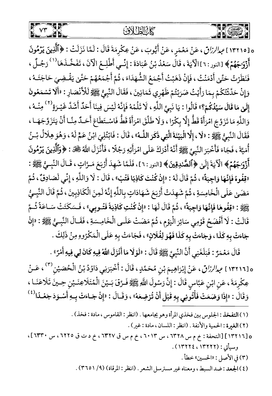 13215 - عبد الرزاق، عَنْ مَعْمَرٍ، عَنْ أَيُّوبَ، عَنْ عِكْرَمَةَ قَالَ: لَمَّا نَزَلَتِ: {الذِّينَ يَرْمُونَ أَزْوَاجَهُمْ} الآيَةَ. قَالَ سَعْدُ بن عُبَادَةَ: أَيُّ لَكَاعٍ، أَلاَ إِنْ تَفَخَّذَهَا (1) رَجُلٌ، فَنَظَرَتُ حَتَّى أدمنت، فَإِنْ ذَهَبْتُ أَجْمَعُ الشُّهَدَاءَ، ثُمَّ أَجْمَعُهُمْ حَتَّى يَقْضِيَ حَاجَتَهُ، وَإِنْ حَدَّثْتُكُمْ بِمَا رَأَيْتُ ضَرَبْتُمْ ظَهْرِي ثَمَانِينَ. فَقَالَ النَّبِيُّ صَلَّى اللهُ عَلَيْهِ وَسَلَّمَ لِلأَنْصَارِ: أَلاَ تَسْمَعُونَ إِلَى مَا قَالَ سَيِّدُكُمْ؟ قَالُوا: يَا نَبِيَّ اللهِ، لاَ تَلُمْهُ، فَإِنَّهُ لَيْسَ فِينَا أَحَدٌ أَشَدَّ غَيْرَةٍ مِنْهُ، وَاللهِ مَا تَزَوَّجَ امْرَأَةً قَطُّ إِلاَّ بِكْرًا، وَلاَ طَلَّقَ امْرَأَةً قَطُّ فَاسْتَطَاعَ أَحَدٌ مِنَّا أَنْ يَتَزَوَّجَهَا. فَقَالَ النَّبِيُّ صَلَّى اللهُ عَلَيْهِ وَسَلَّمَ: لاَ، إِلاَّ الْبَيِّنَةَ الَّتِي ذَكَرَ اللهُ. قَالَ: فَابْتُلِيَ ابْنُ عَمٍّ لَهُ، وَهُوَ هِلاَلُ بن أُمَيَّةَ، فَجَاءَ، فَأَخْبَرَ النَّبِيَّ صَلَّى اللهُ عَلَيْهِ وَسَلَّمَ أَنَّهُ أَدْرَكَ عَلَى امْرَأَتِهِ رَجُلاً، فَأَنْزَلَ اللهُ عَزَّ وَجَلَّ: {وَالَّذِينَ يَرْمُونَ أَزْوَاجَهُمْ} الآيَةَ، إِلَى: {الصَّادِقِينَ}. فَلَمَّا شَهِدَ أَرْبَعَ مَرَّاتٍ، قَالَ النَّبِيُّ صَلَّى اللهُ عَلَيْهِ وَسَلَّمَ: قِفُوهُ، فَإِنَّهَا وَاجِبَةٌ، ثُمَّ قَالَ لَهُ: إِنْ كُنْتَ كَاذِبًا فَتُبْ. قَالَ: لاَ وَاللهِ، إِنِّي لَصَادِقٌ. ثُمَّ مَضَى عَلَى الْخَامِسَةِ، ثُمَّ شَهِدَتْ أَرْبَعَ شَهَادَاتٍ باللهِ إِنَّهُ لَمِنَ الْكَاذِبِينَ، ثُمَّ قَالَ النَّبِيُّ صَلَّى اللهُ عَلَيْهِ وَسَلَّمَ: قِفُوهَا، فَإِنَّهَا وَاجِبَةٌ، ثُمَّ قَالَ لَهَا: إِنْ كُنْتِ كَاذِبَةً فَتُوبِي، فَسَكَتَتْ سَاعَةً، ثُمَّ قَالَتْ: لاَ أَفْضَحُ قَوْمِي سَائِرَ الْيَوْمِ، ثُمَّ مَضَتْ عَلَى الْخَامِسَةِ. فَقَالَ النَّبِيُّ صَلَّى اللهُ عَلَيْهِ وَسَلَّمَ: إِنْ جَاءَتْ بِهِ كَذَا، وَجَاءَتْ بِهِ كَذَا، فَهُوَ لِفُلاَنٍ، فَجَاءَتْ بِهِ عَلَى المَكْرُوهِ مِنْ ذَلِكَ.