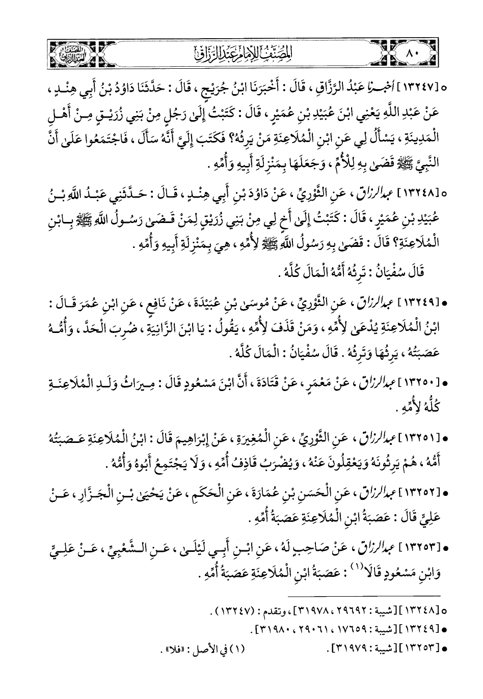 13247- أخبرنا عبد الرزاق، قَالَ: أَخْبَرَنَا ابْنُ جُرَيْجٍ، قَالَ: حَدَّثنا دَاوُدُ بن أَبِي هِنْدٍ، عَنْ عَبدِ اللهِ، يَعْنِي ابْنَ عُبَيْدِ بْنِ عُمَيْرٍ قَالَ: كَتَبْتُ إِلَى رَجُلٍ مِنْ بَنِي زُرَيْقٍ مِنْ أَهْلِ المَدِينَةِ يَسْأَلُ [لِي] (1) عَنِ ابْنِ المُلاَعِنَةِ مَنْ يَرِثُهُ؟ فَكَتَبَ إِلَيَّ أَنَّهُ سَأَلَ، فَاجْتَمَعُوا عَلَى أَنَّ النَّبِيَّ صَلَّى اللهُ عَلَيْهِ وَسَلَّمَ قَضَى بِهِ لِلأُمِّ، وَجَعَلَهَا بِمَنْزِلَةِ أَبِيهِ وَأُمِّهِ.