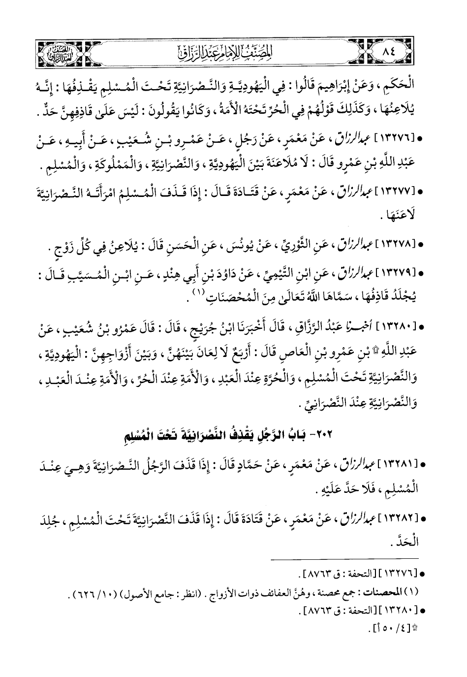 13282- عبد الرزاق، عَنْ مَعْمَرٍ، عَن قَتَادَةَ، قَالَ: إِذَا قَذَفَ النَّصْرَانِيَّةَ تَحْتَ المُسْلِمِ جُلِدَ الْحَدَّ.
