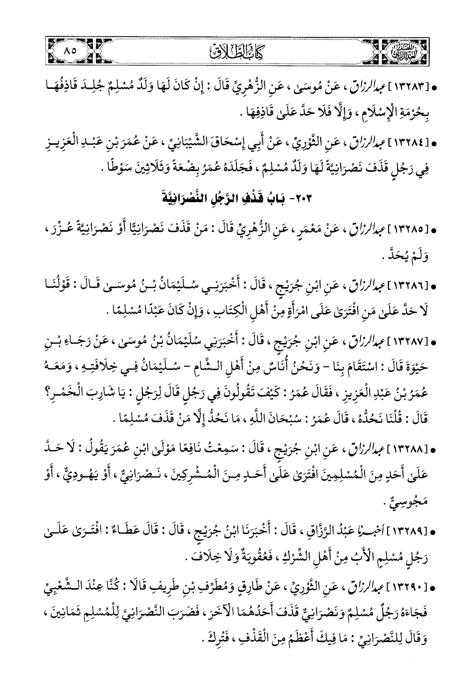 13285- عبد الرزاق، عَنْ مَعْمَرٍ، عَنِ الزُّهْرِيِّ، قَالَ: مَنْ قَذَفَ نَصْرَانِيًّا، أَوْ نَصْرَانِيَّةً عُزِّرَ، وَلَمْ يُحَدَّ.