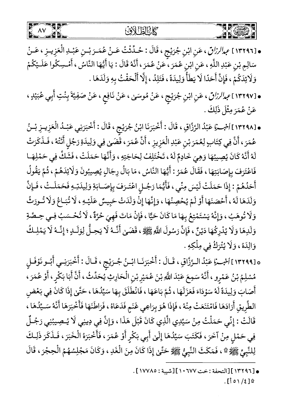 13298- أخبرنا عبد الرزاق، قَالَ: أَخْبَرَنَا ابْنُ جُرَيْجٍ، قَالَ: أَخْبَرَنِي عَبدُ الْعَزِيزِ بن عُمَرَ، أَنَّ فِي كِتَابٍ لِعُمَرَ بْنِ عَبدِ الْعَزِيزِ، أَنَّ عُمَرَ قَضَى فِي وَلِيدَةِ رَجُلٍ أَتَتْهُ، فَذَكَرَتْ لَهُ، أَنَّهُ كَانَ يُصِيبُهَا وَهِيَ خَادِمٌ لَهُ، تَخْتَلِفُ لِحَاجَتِهِ، وَأَنَّهَا حَمَلَتْ، فَشَكَّ فِي حَمْلِهَا، فَاعْتَرَفَ بِإِصَابَتِهَا، فَقَالَ عُمَرُ: أَيُّهَا النَّاسُ، مَا بَالُ رِجَالٍ يُصِيبُونَ وَلاَئِدَهُمْ، ثُمَّ يَقُولُ أَحَدُهُمْ إِذَا حَمِلَتْ: لَيْسَ مِنِّي. فَأَيُّمَا رَجُلٍ اعْتَرَفَ بِإِصَابَةِ وَلِيدَتِهِ فَحَمَلَتْ، فَإِنَّ وَلَدَهَا لَهُ، أَحْصَنَهَا، أَوْ لَمْ يُحْصِنْهَا، وَإِنَّهَا إِنْ وَلَدَتْ حَبِيسٌ عَلَيْهِ لاَ تُبَاعُ وَلاَ تُورَثُ وَلاَ تُوهَبُ، وَإِنَّهُ يَسْتَمْتِعُ بِهَا مَا كَانَ حَيًّا، فَإِنْ مَاتَ فَهِيَ حُرَّةٌ لاَ تُحْسَبُ فِي حِصَّةِ وَلَدِهَا، وَلاَ يُدْرِكُهَا دَيْنٌ، فَإِنَّ رَسُولَ اللهِ صَلَّى اللهُ عَلَيْهِ وَسَلَّمَ قَضَى أَنَّهُ لاَ يَحِلُّ لِوَلَدٍ أَنَّهُ لاَ يَمْلِكُ وَالِدُهُ وَلاَ يُتْرَكُ فِي مِلْكِهِ.