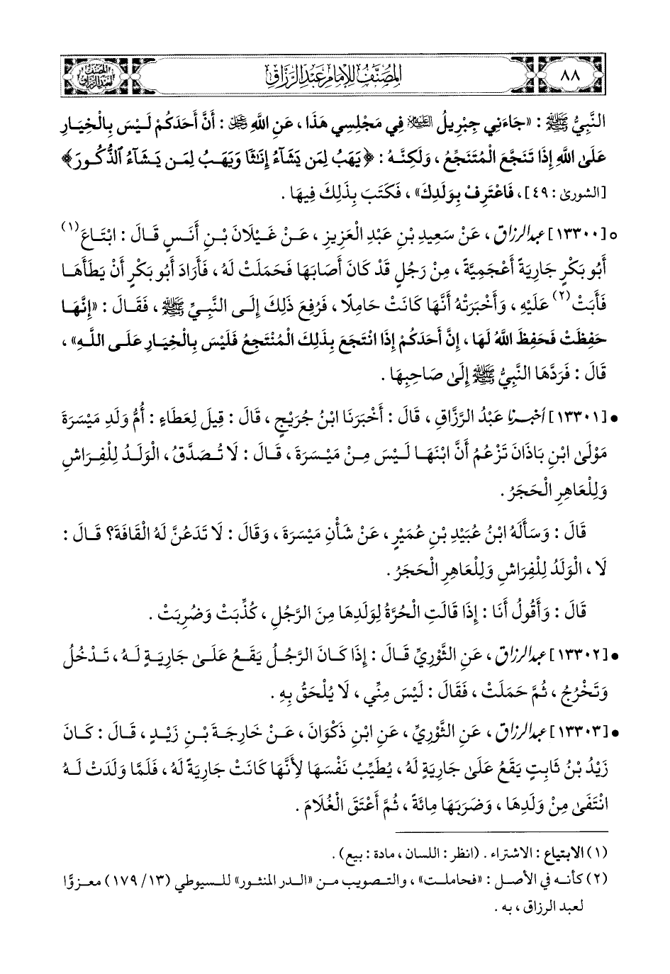 13303- عبد الرزاق، عَنِ الثَّورِيِّ، عَنِ ابْنِ ذَكْوَانَ، عَن خَارِجَةَ بْنِ زَيْدٍ قَالَ: كَانَ زَيْدُ بن ثَابِتٍ يَقَعُ عَلَى جَارِيَةٍ لَهُ يُطَيِّبُ (1) نَفْسَهَا، لأَنَّهَا كَانَتْ جَارِيَةً لَهُ، فَلَمَّا وَلَدَتْ لَهُ انْتَفَى مِنْ وَلَدِهَا وَضَرَبَهَا مِئَةً، ثُمَّ أَعْتَقَ الْغُلاَمَ.